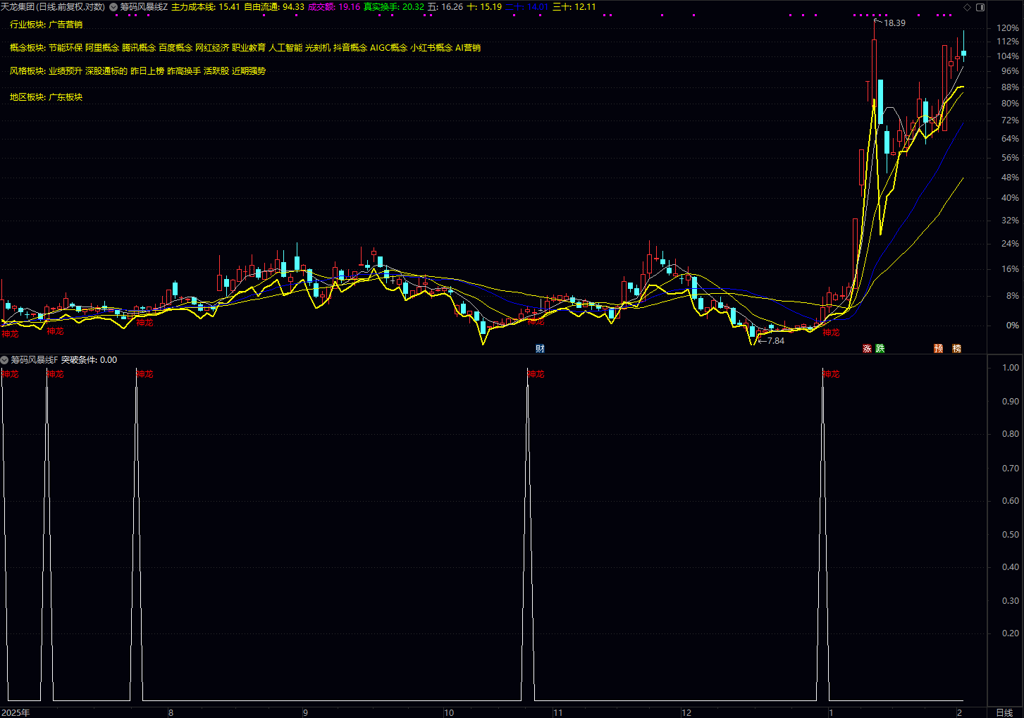 (通达信筹码风暴线指标基于成本分布与量能配合设计,通过测算特定周期内不同分位的持仓成本,筛选出标注 “神龙” 信号,提示潜在上涨机会。)