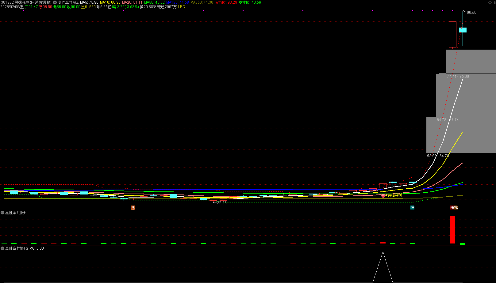 (通达信【高胜率共振】主副图选股 筹码集中度 ,压力位阳线突破, 120日均线趋势共振捉妖 )