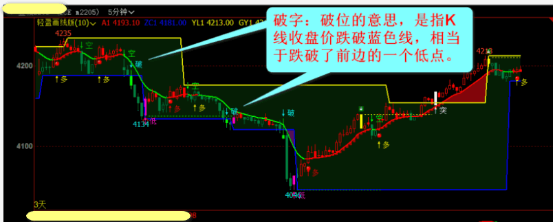 二:“突”字是突破黄线,相当于突破了左边的高点,“破”字是跌破蓝线,相当于跌破了了前边的一个低点。也相当于破位。