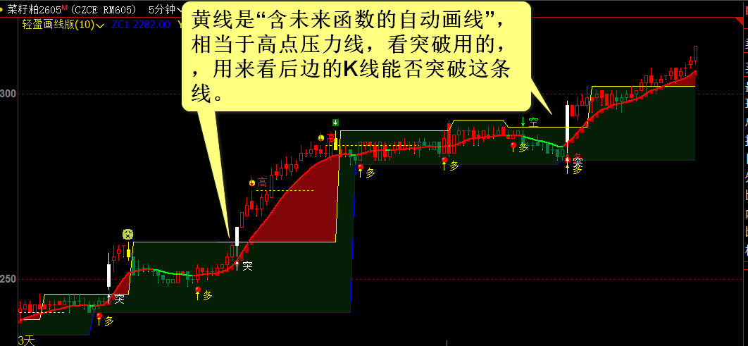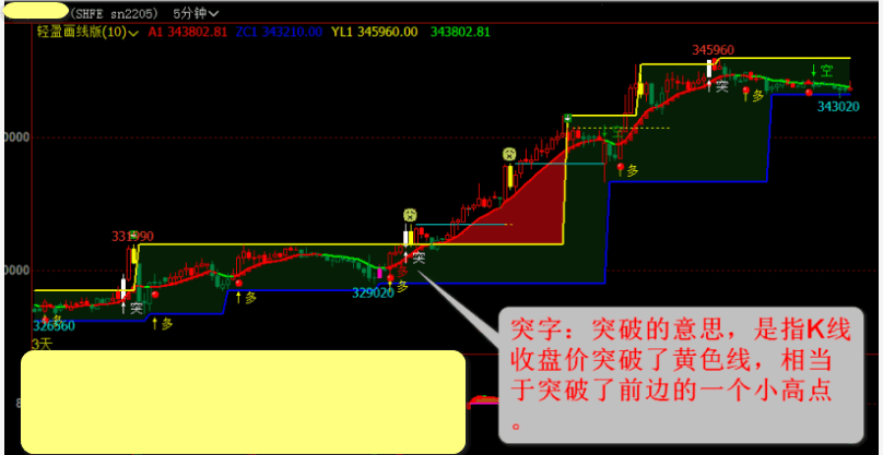 因为黄线蓝线是自动画线,有未来函数,这个突字是突破了黄线,也用到了未来函数,但它是等黄线画出来之后,然后再看它是否突破黄线。出突字是可以看到的,也可以发声提醒的。