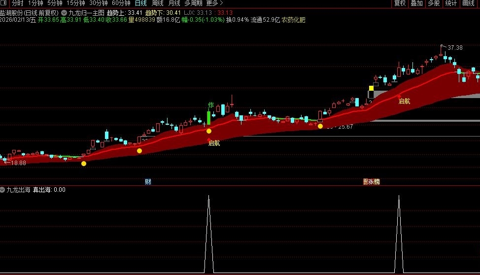 “启航”图标配合小黄点(倍量),表明洗盘结束、放量启动,适合激进投资者半路介入。