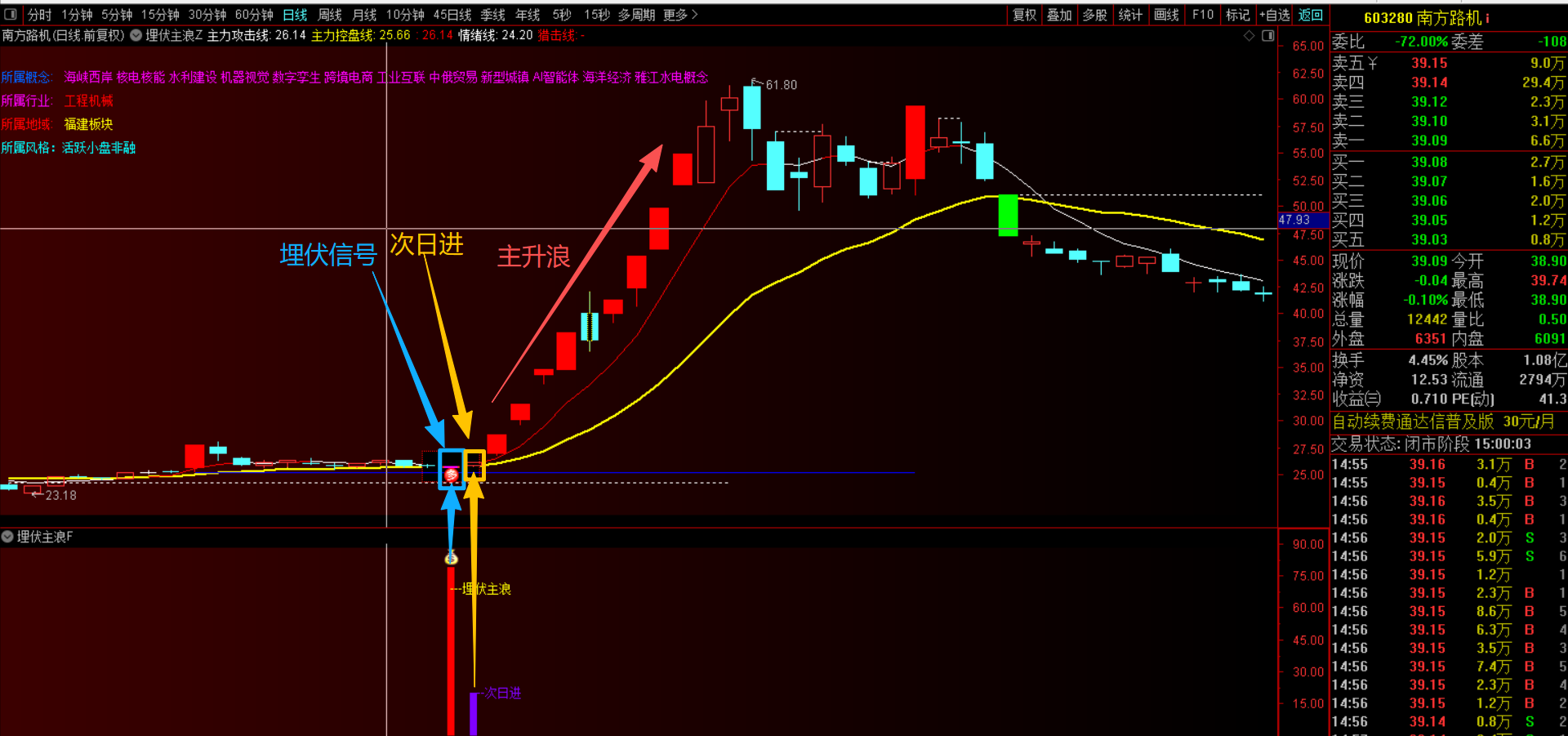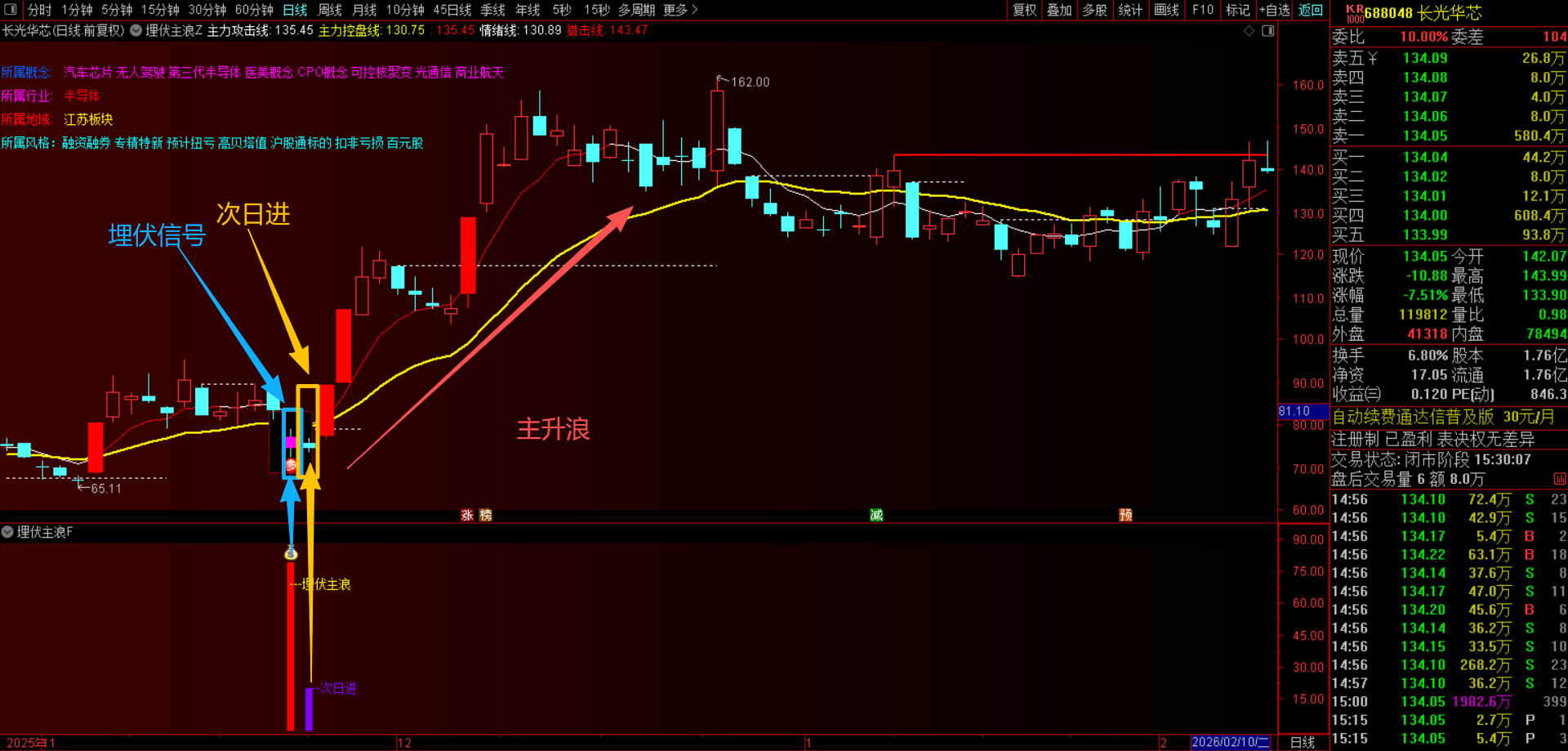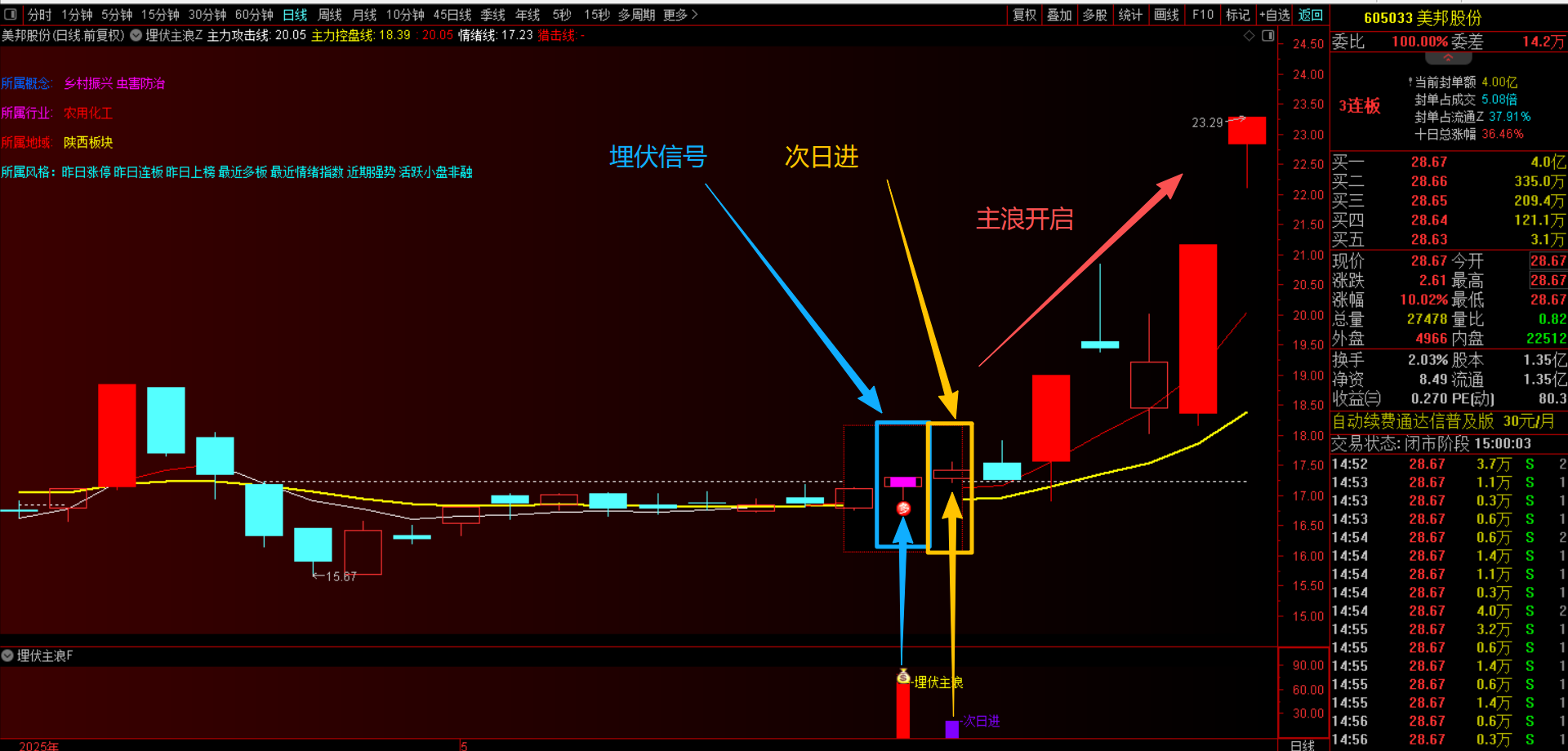 通达信【埋伏主浪】精品主副选指标 包含1主1副图1选股指标 专注潜伏主升启动,精准低吸抓连板机会设计, 通过多维度条件严格筛选优质标的,信号少质量高。