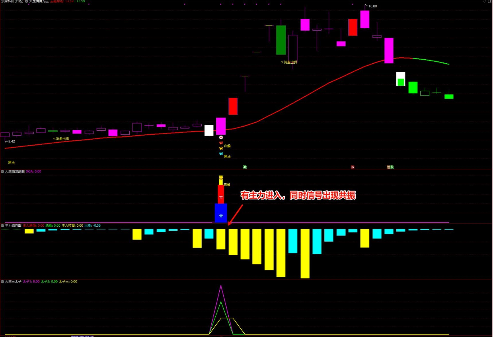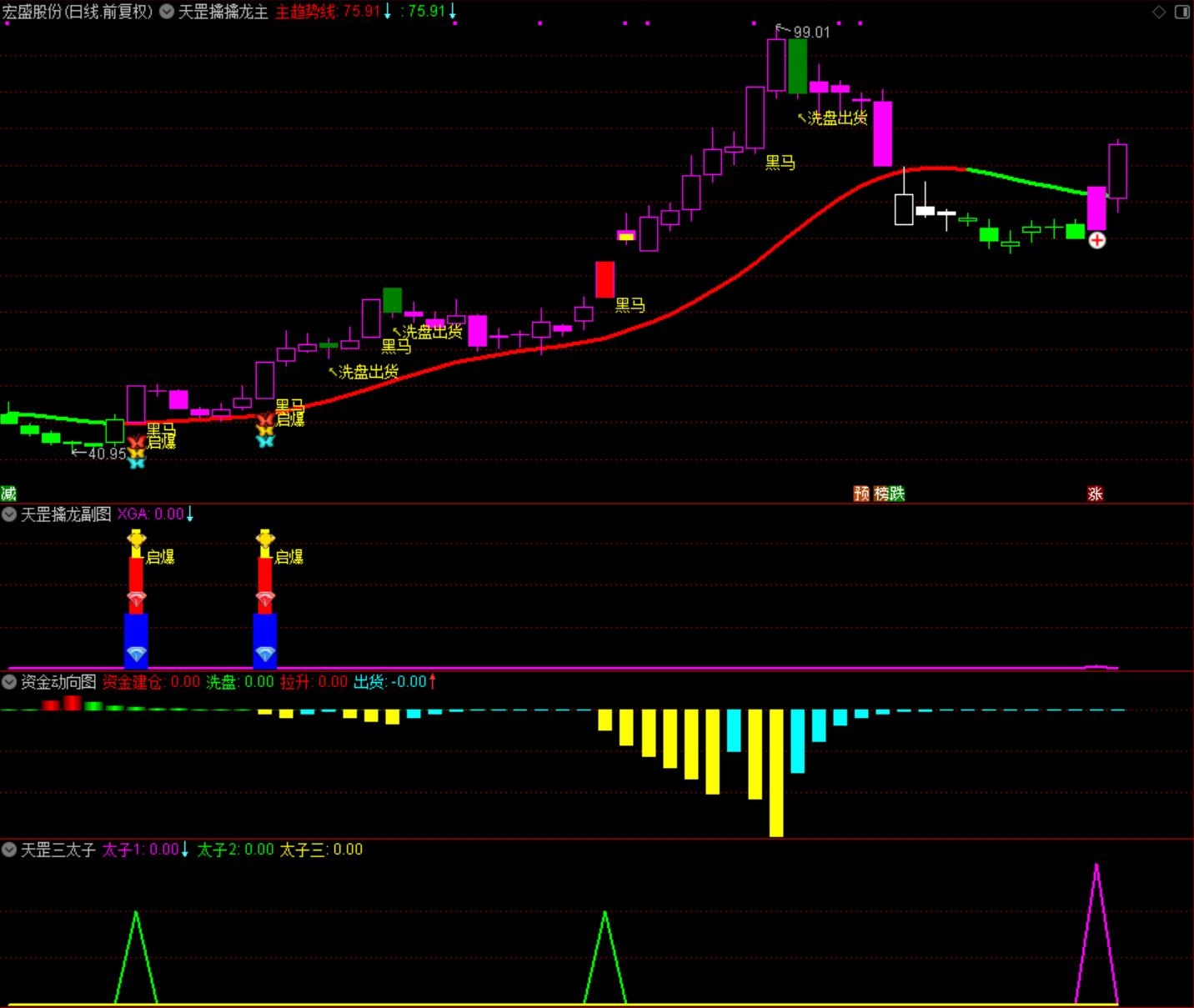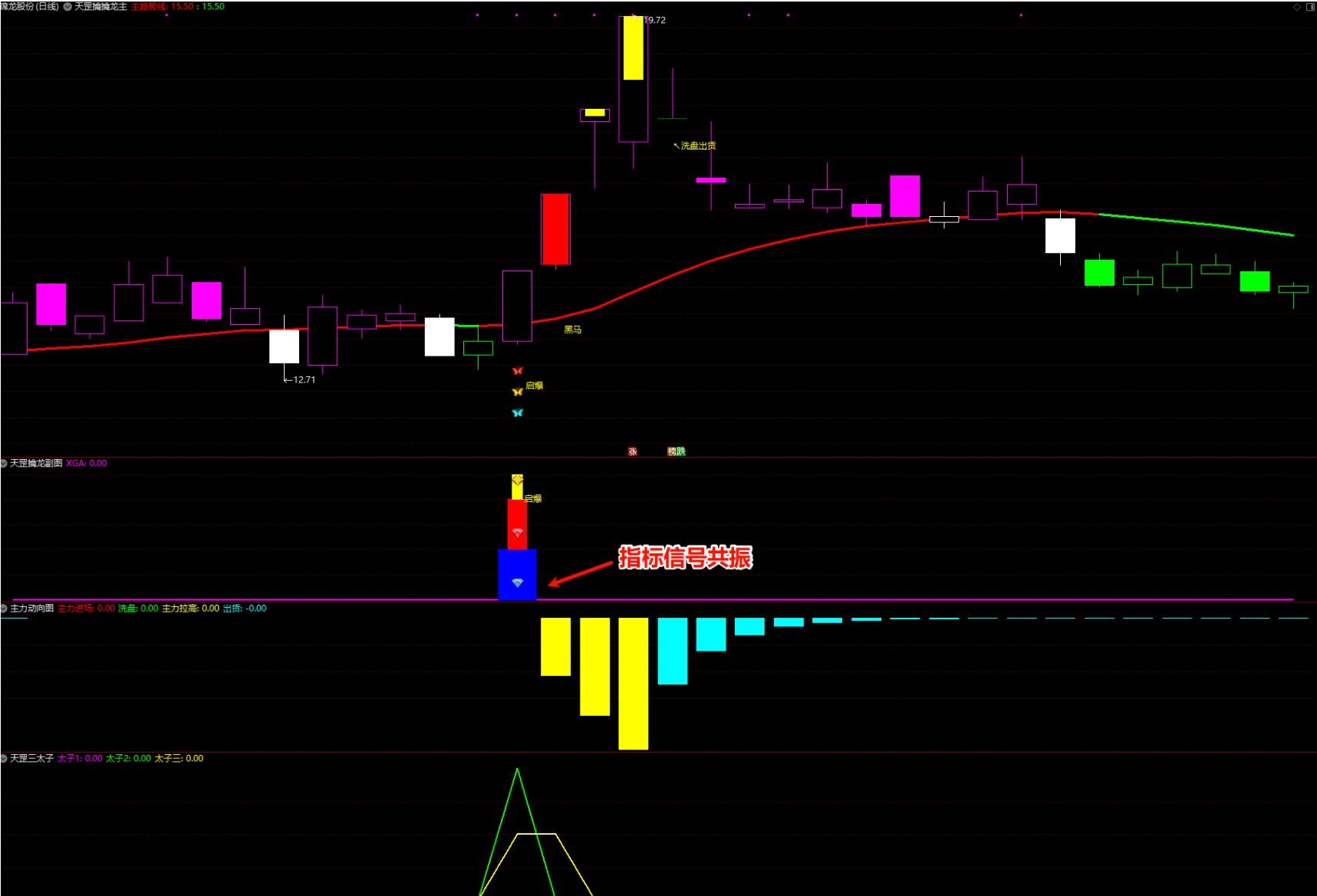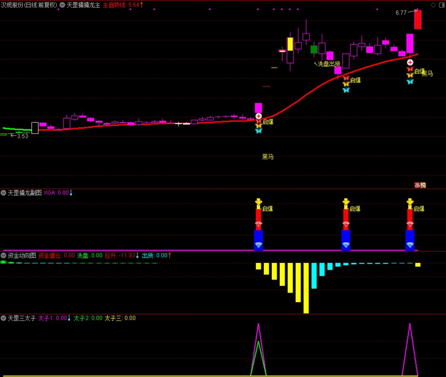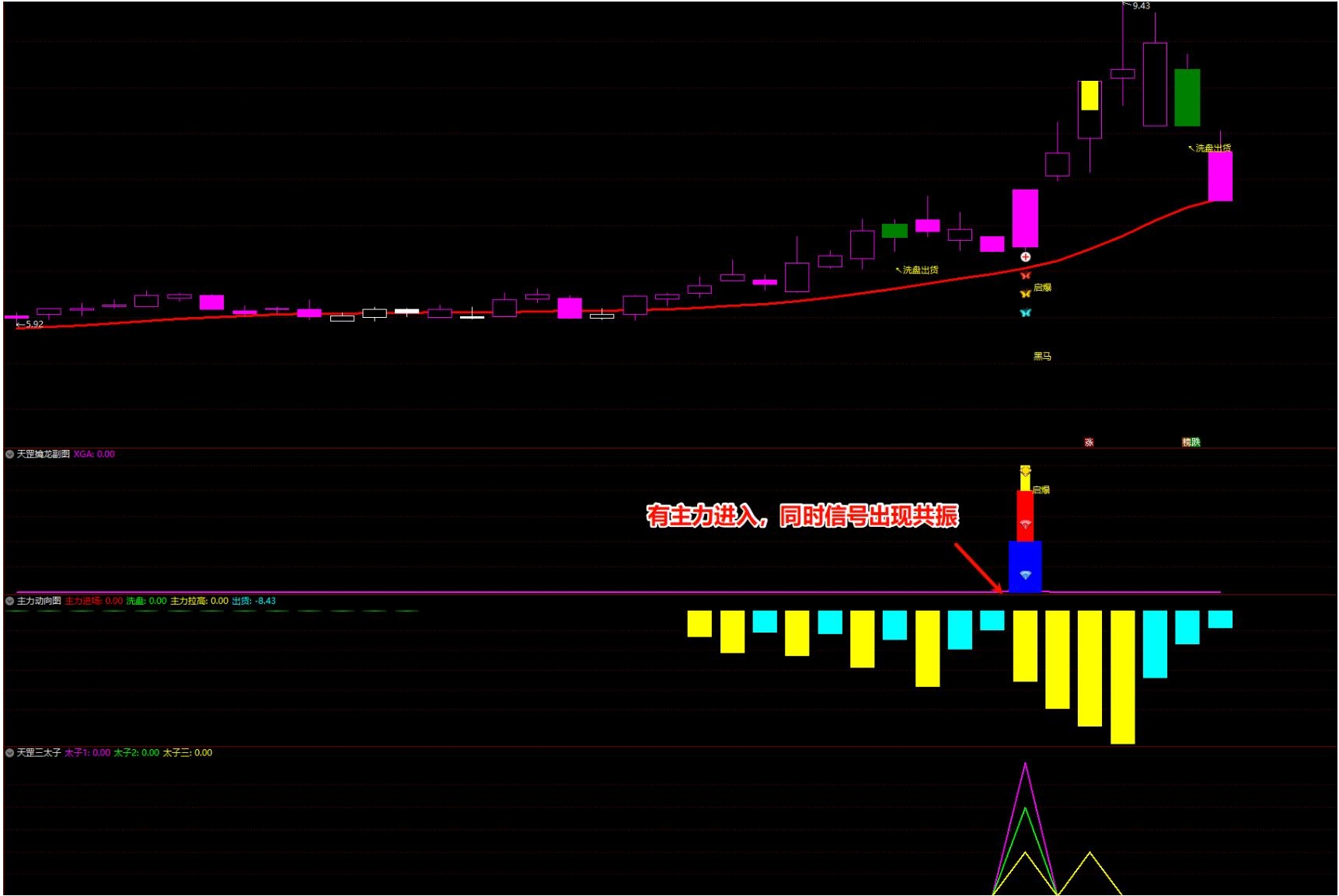 全套共计8个指标,一主图,三个副图,四个选股;信号分别为三太子1、2、3信号,以及黑马启动信号;