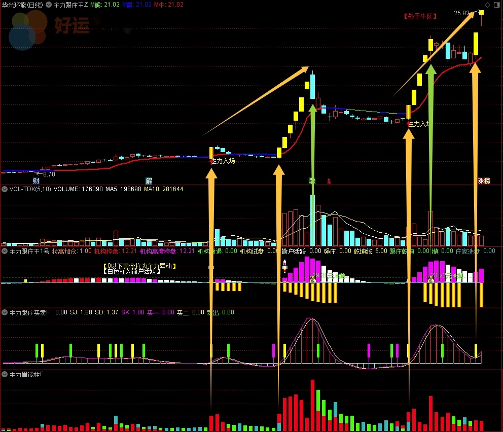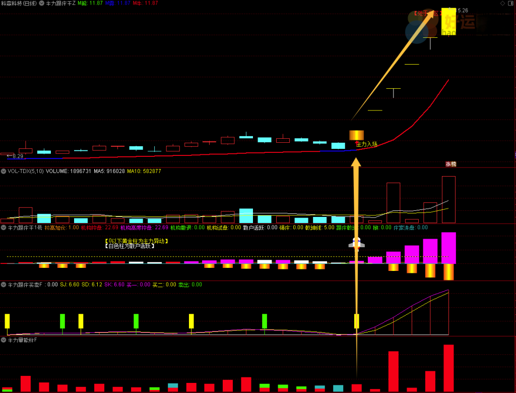 5,黄色柱:代表涨停板或最高价位有过涨停板; 6,黄金柱:代表有大资金异动,主力入场,是一个介入信号;如此信号出现后续未开启主升(10个交易日内)先离场,后续股价突破此信号最高价也是一个介入信号;如股价下穿此信号最低价,先清仓离场,等待下一个机会出现;