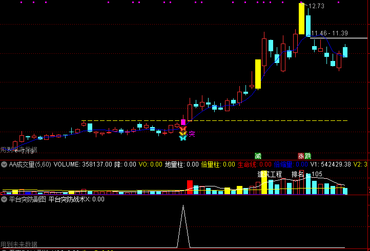 突破预警:股价带量突破时, magenta色标注+三图标共振
