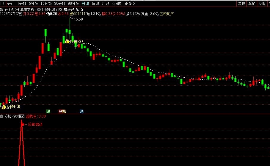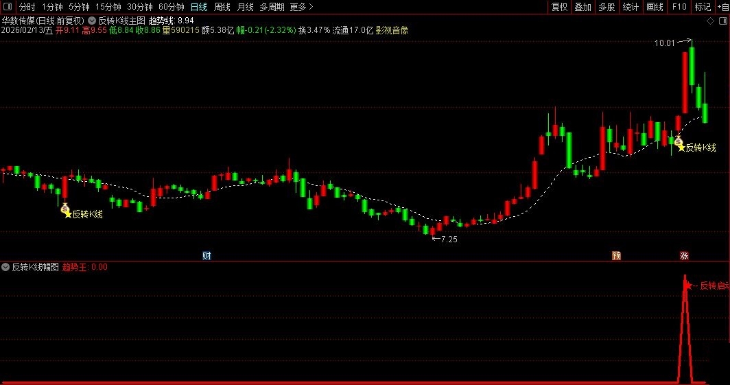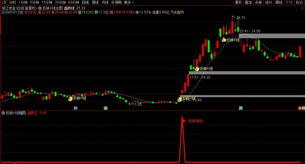 主图出现★反转K线”字样,且K线变为红色实体时,代表反转信号确认。