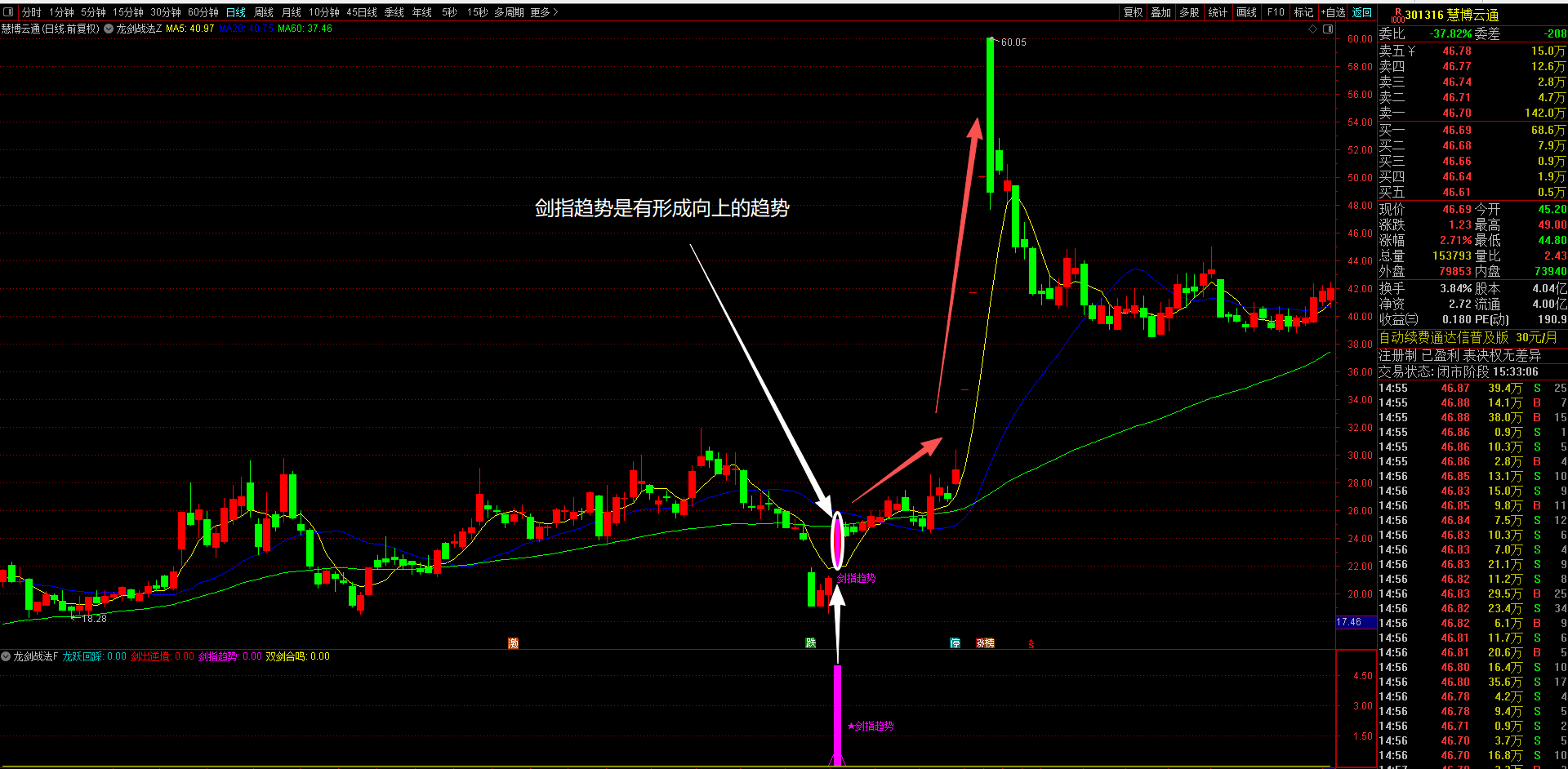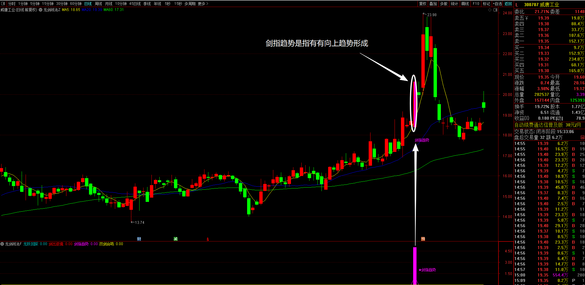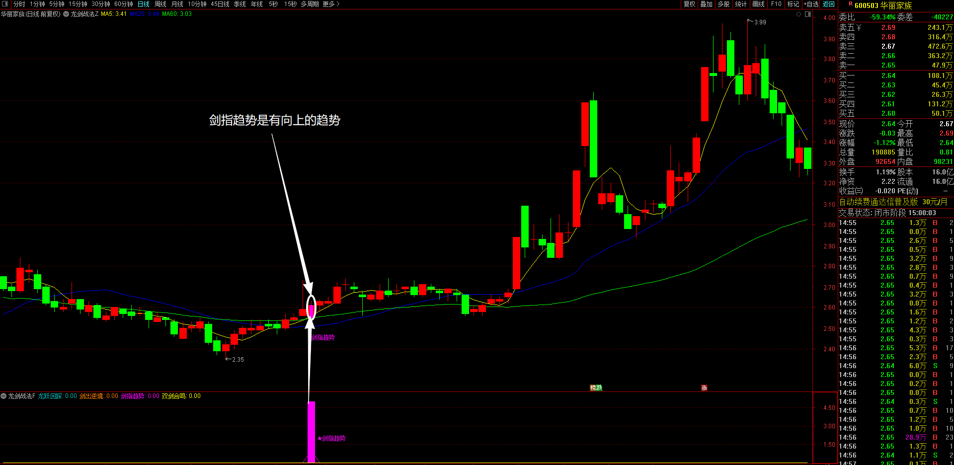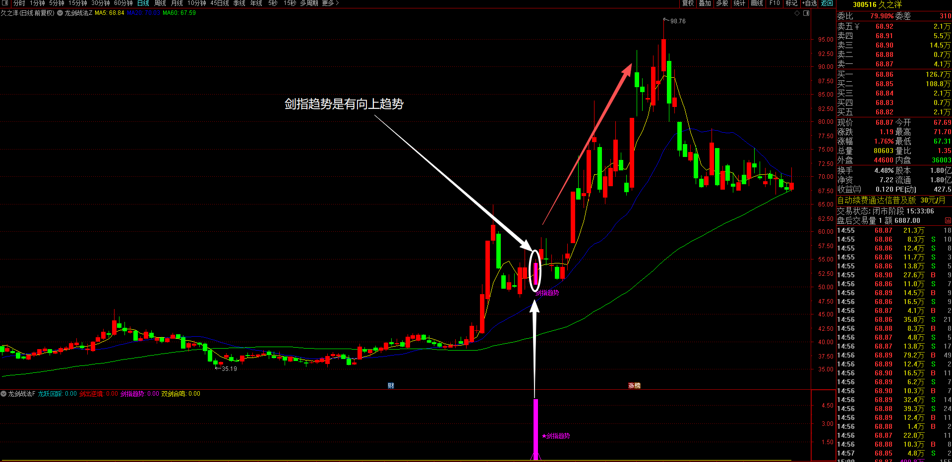 3、剑指趋势策略(洋红色显示)---趋势主升