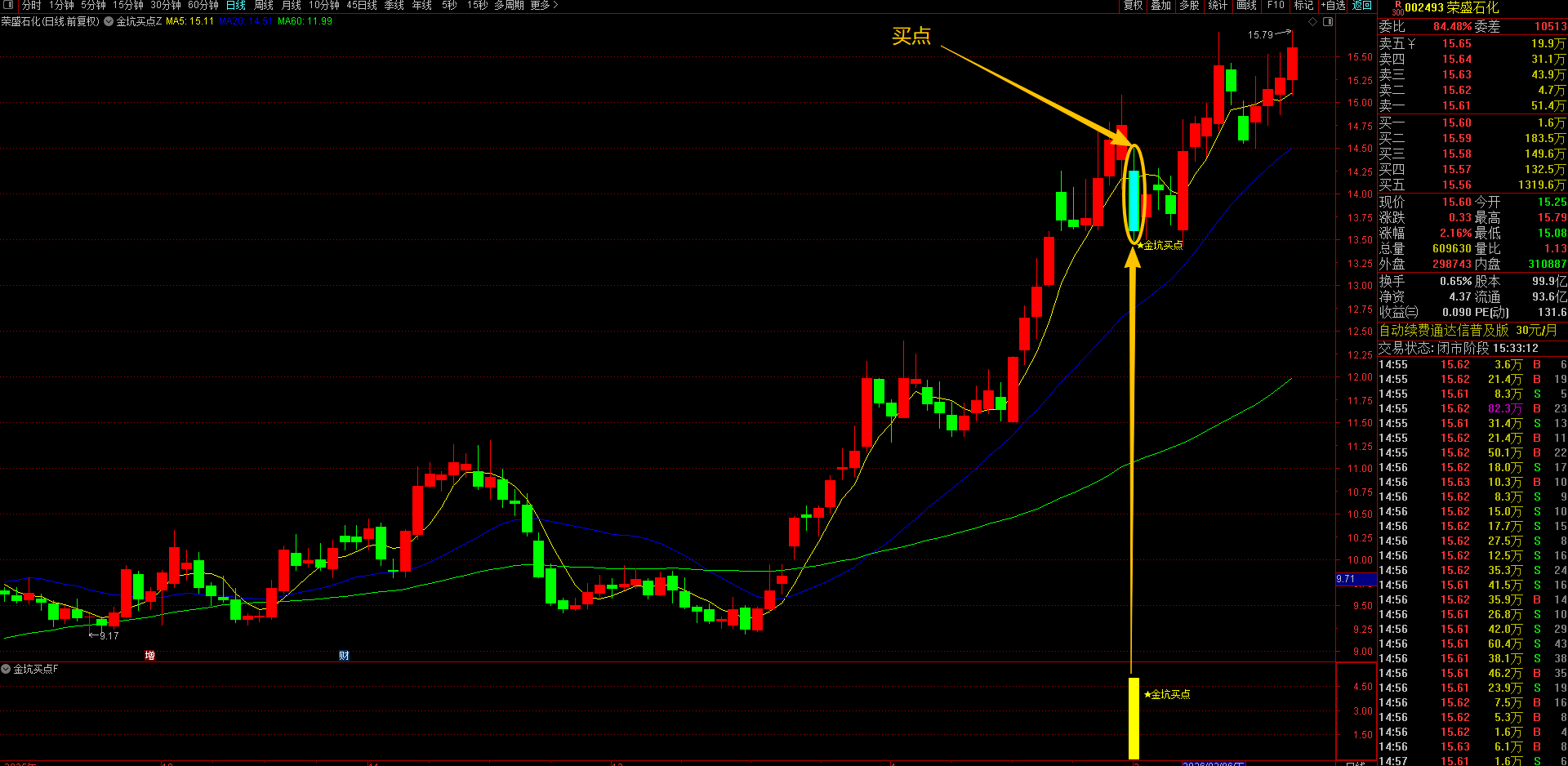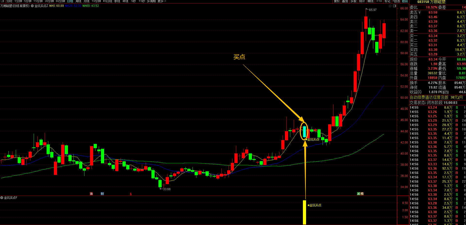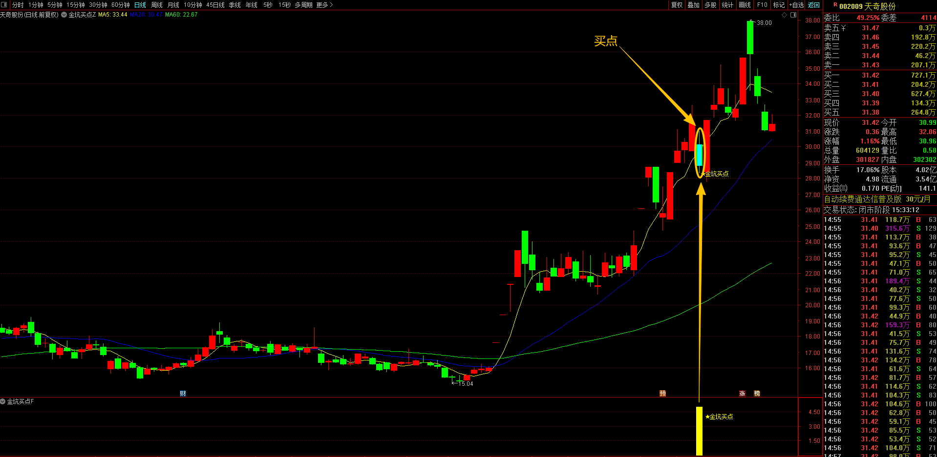 当趋势过滤、形态识别两大条件形成共振时,指标系统将自动触发买入信号。