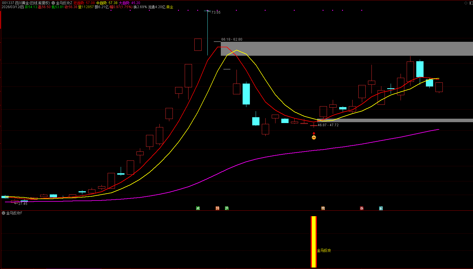 【金马反攻】套装包含主图、副图及选股公式。主图设有短、中、长三条趋势线,可清晰判断整体走势,出现强势反转时会自动提示箭头信号。副图与主图信号同步,通过黄红柱体搭配“金马反攻"文字提示,信号清晰易识别。选股公式能够一键筛选符合条件的个股,指标无未来函数、信号稳定,支持电脑与手机双端使用。