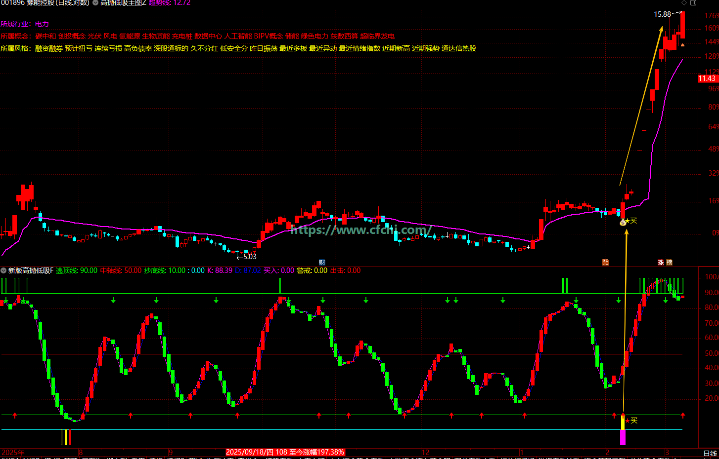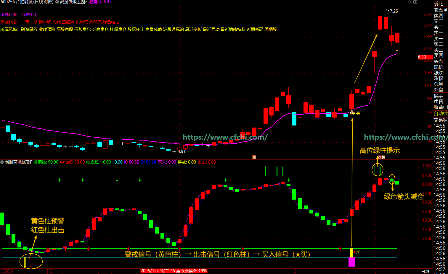 警戒信号(黄色柱) → 出击信号(红色柱) → 买入信号(★买)