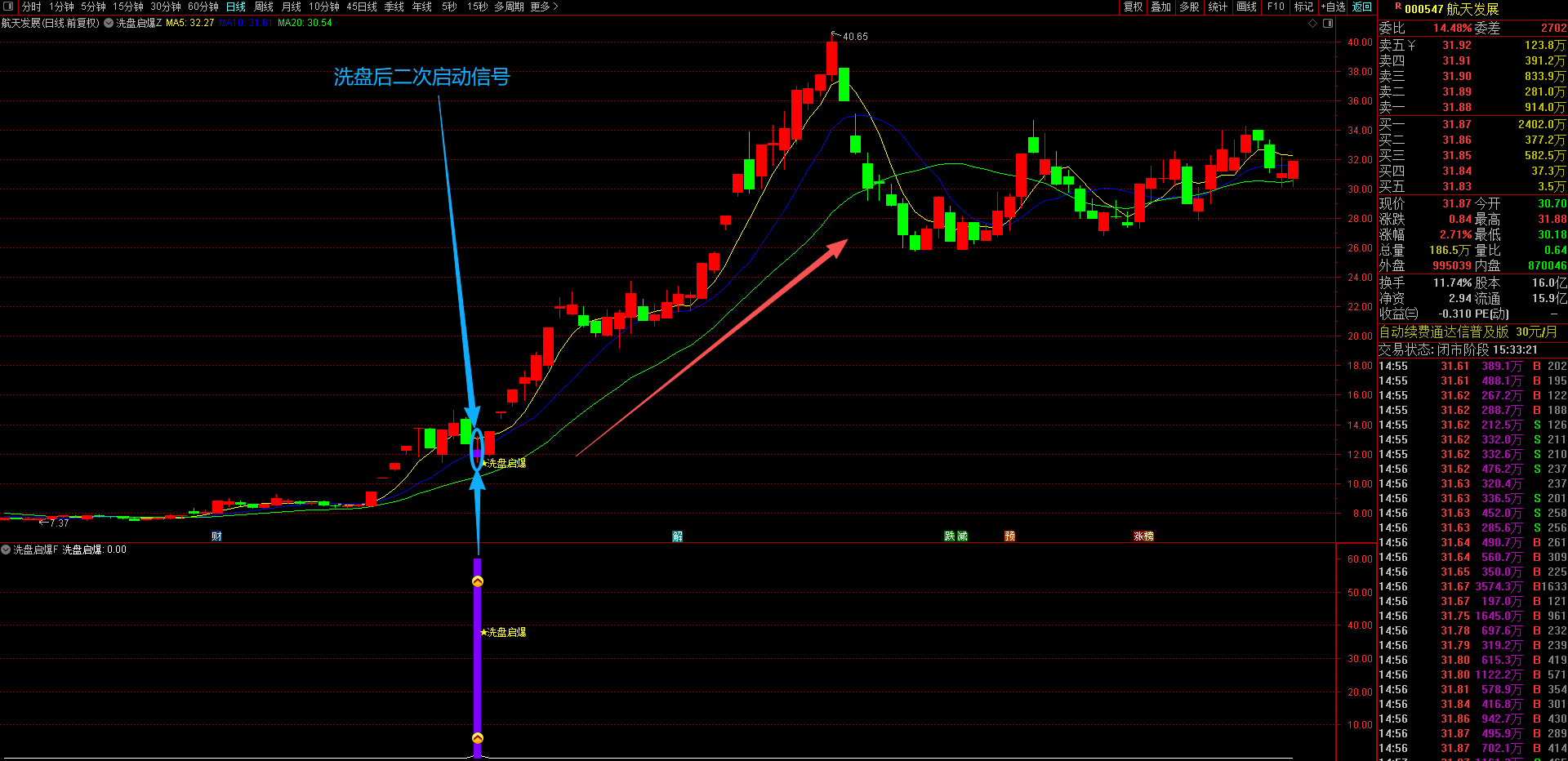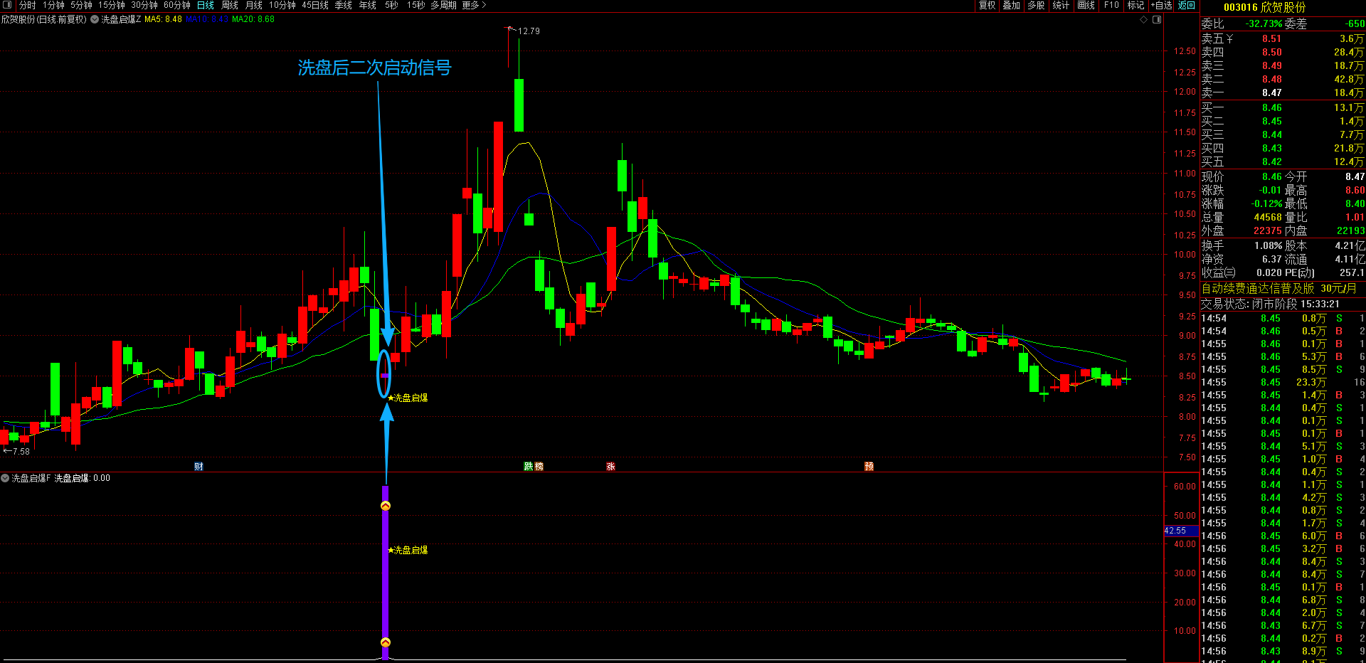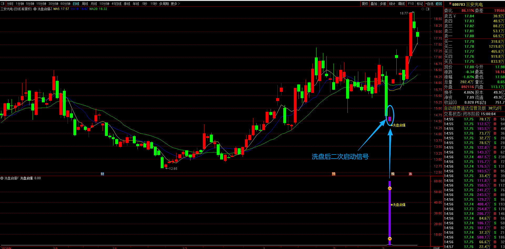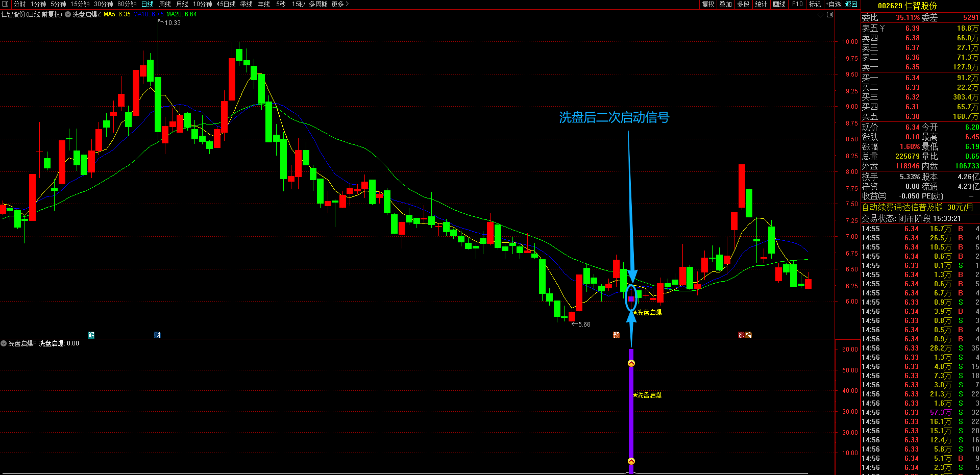 随后,在涨停后寻找实体幅度超过5%、当日跌幅超过5%的大阴线,这被视为主力洗盘行为,且该阴线必须跌破涨停日的收盘价,并是涨停后出现的最大实体阴线;