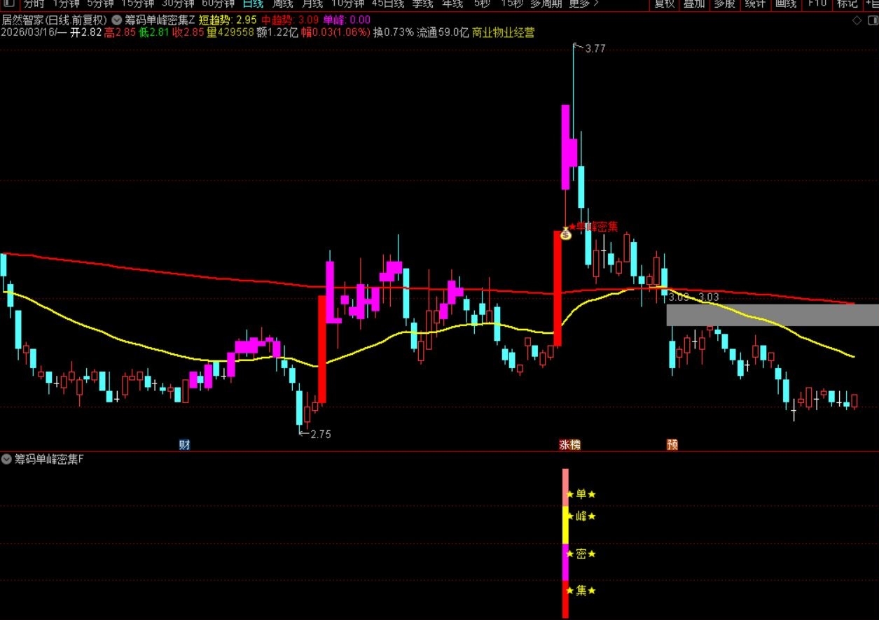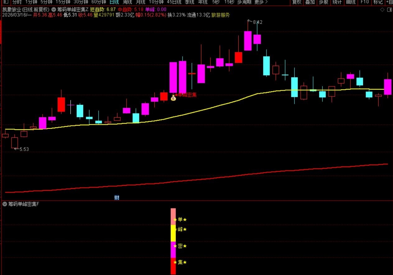 信号含义:当主图出现“★单峰密集”字样或副图出现彩色柱状线时,代表筹码已经高度集中,主力控盘程度极高,股价处于突破的临界点。