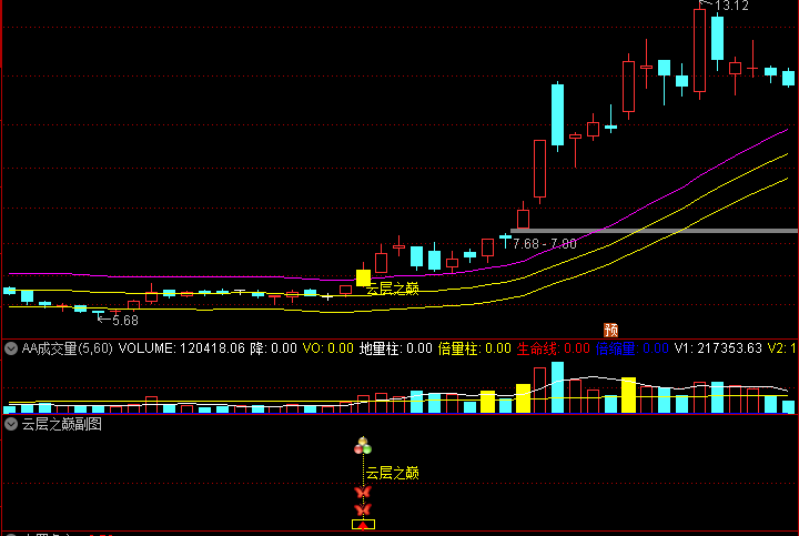 指标通过均线构建动态通道,股价放量突破上轨且涨幅明显时触发“云层之巅“买入信号,捕捉强势股加速启动点,需大阳线确认、放量配合,避免假突破,适合短线追涨。含主图、副图及选股指标。
