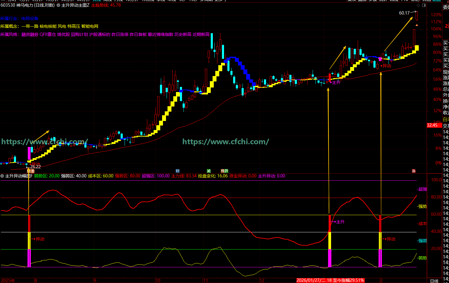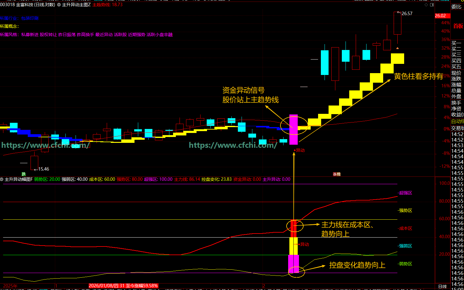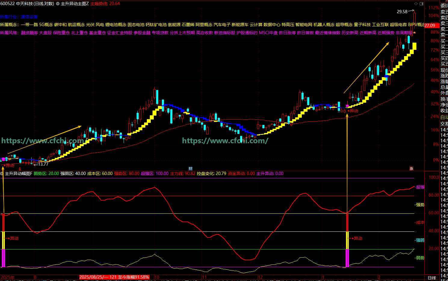 通达信【主升资金异动】指标1主图1幅图3选股、趋势跟踪判断、资金异动和主升浪信号、不含未来函数