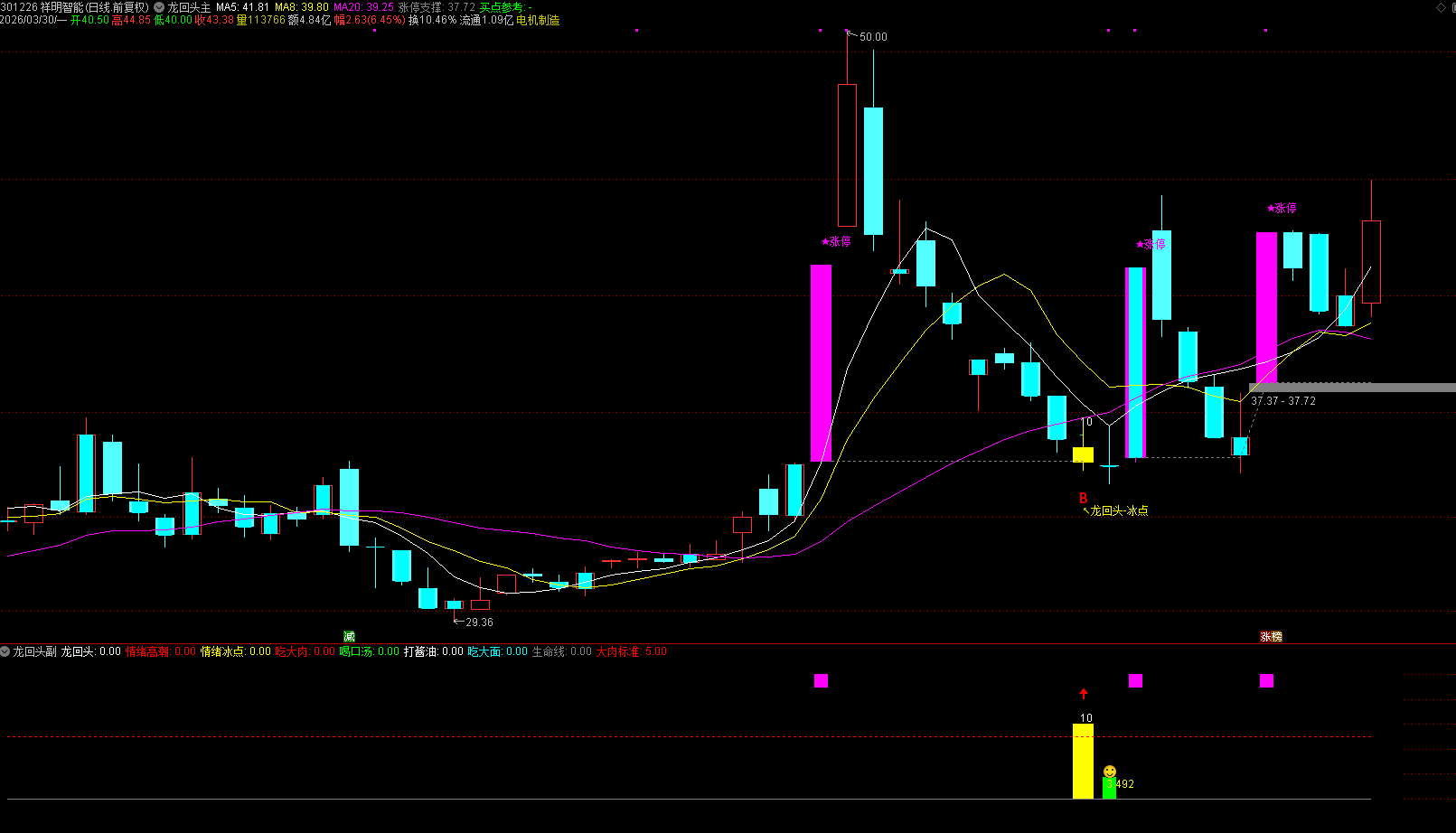 龙头涨停识别:副图紫色柱线标当日涨停龙头标的,结合股票公式指标涨停特征算法提升筛选准确性。