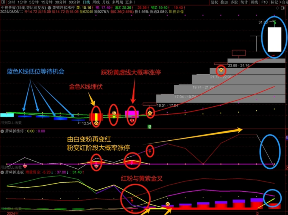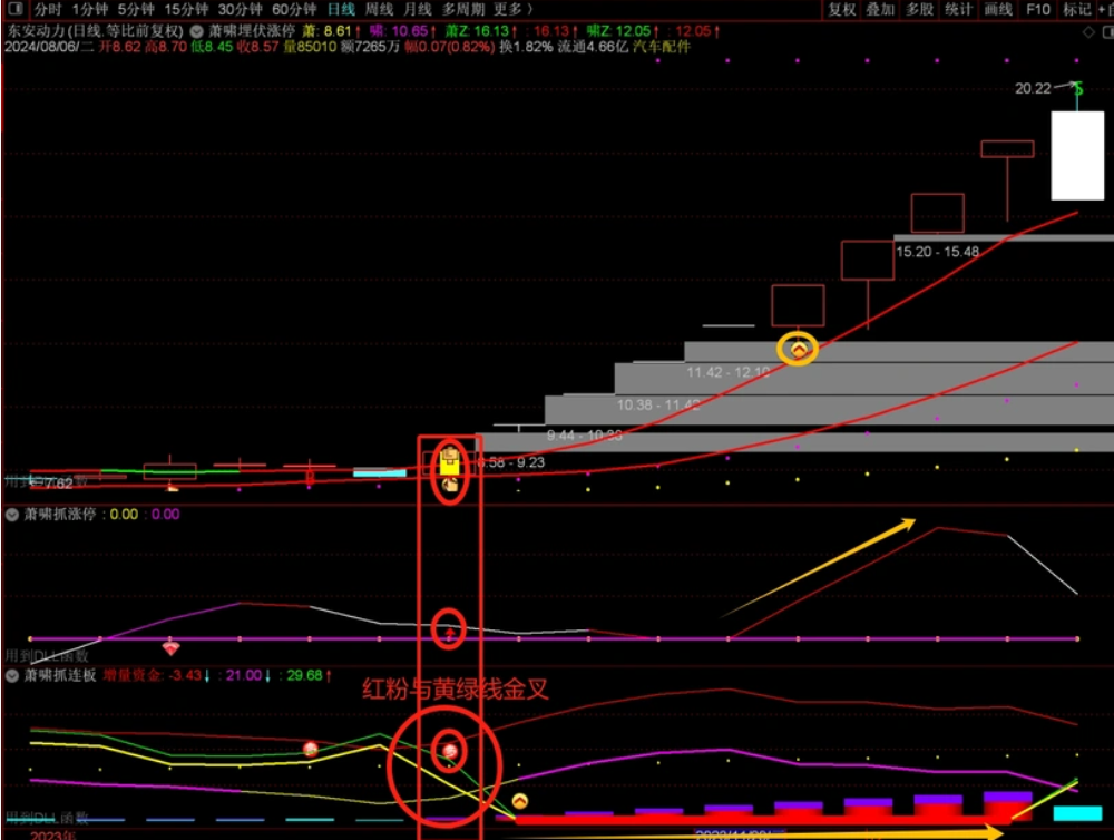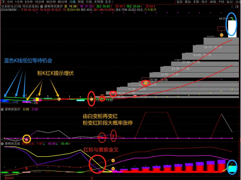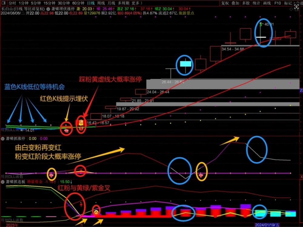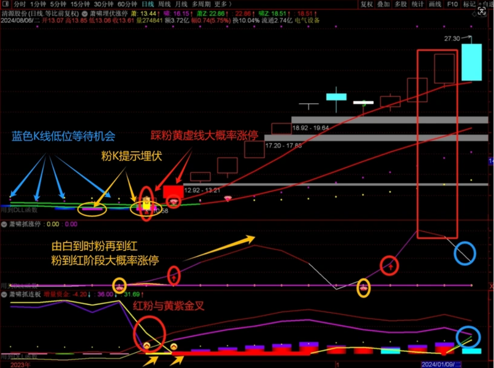 一、主图可以让我们明确低位埋伏涨停的机会,而且当天K线踩主图中的粉黄虚线(点状)则大概率涨停。