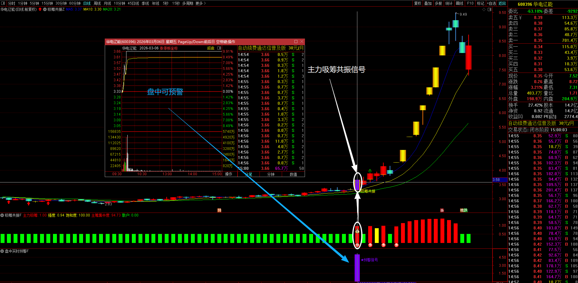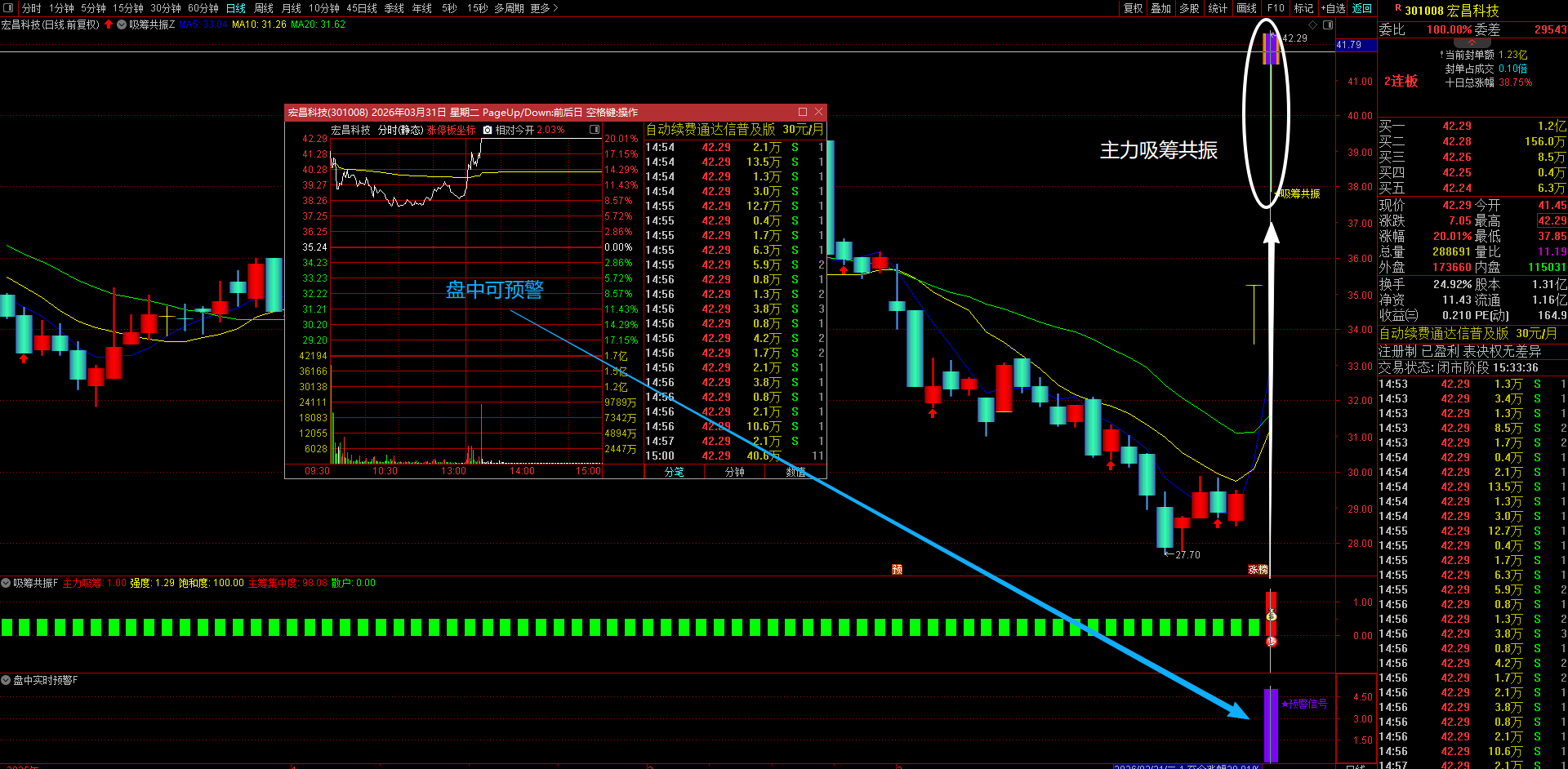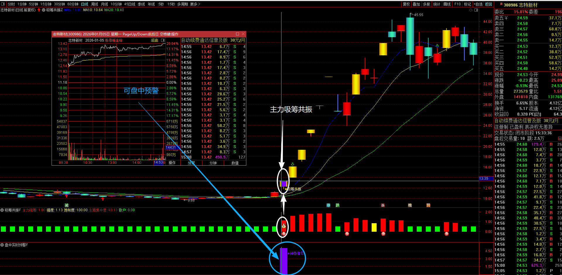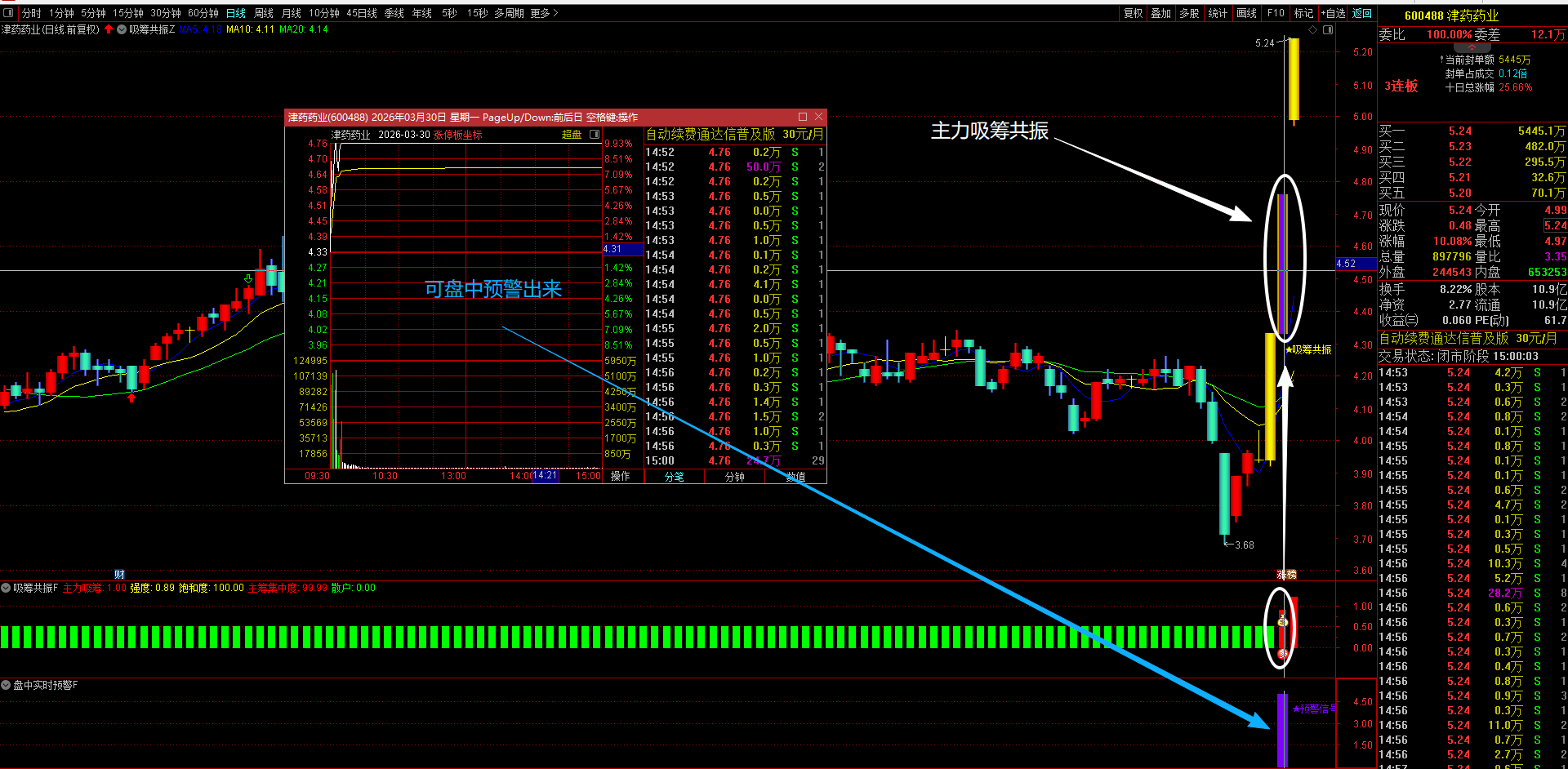 通达信【分时操盘套装指标】(分时操盘主图指标,分时量堆幅图+选股预警指标)