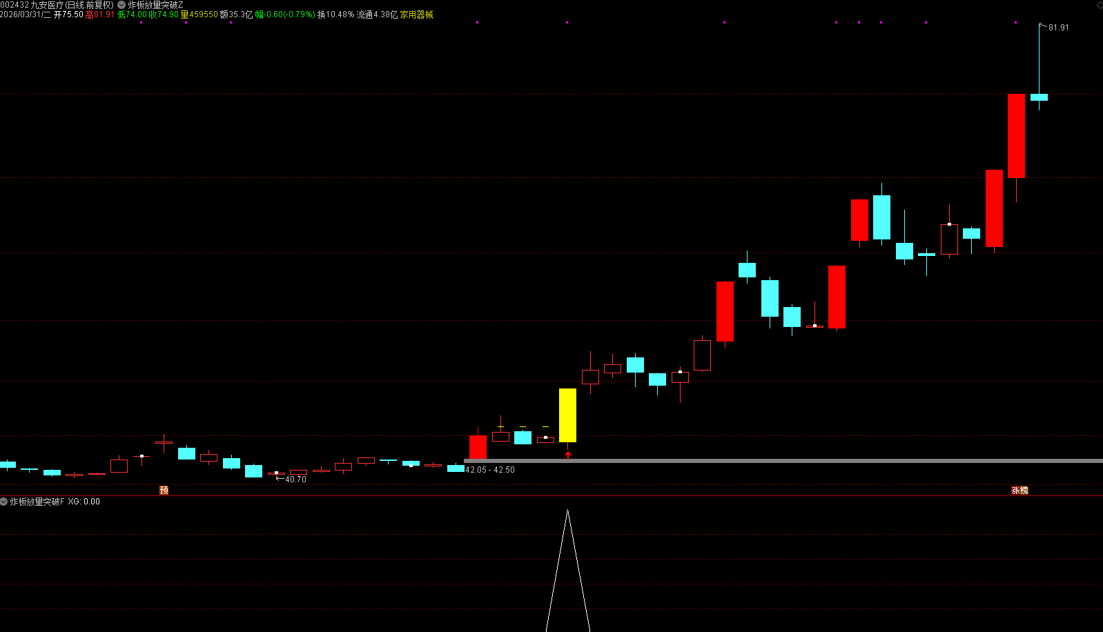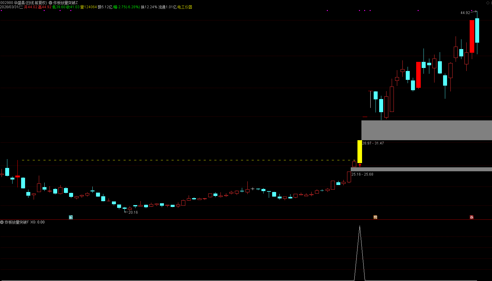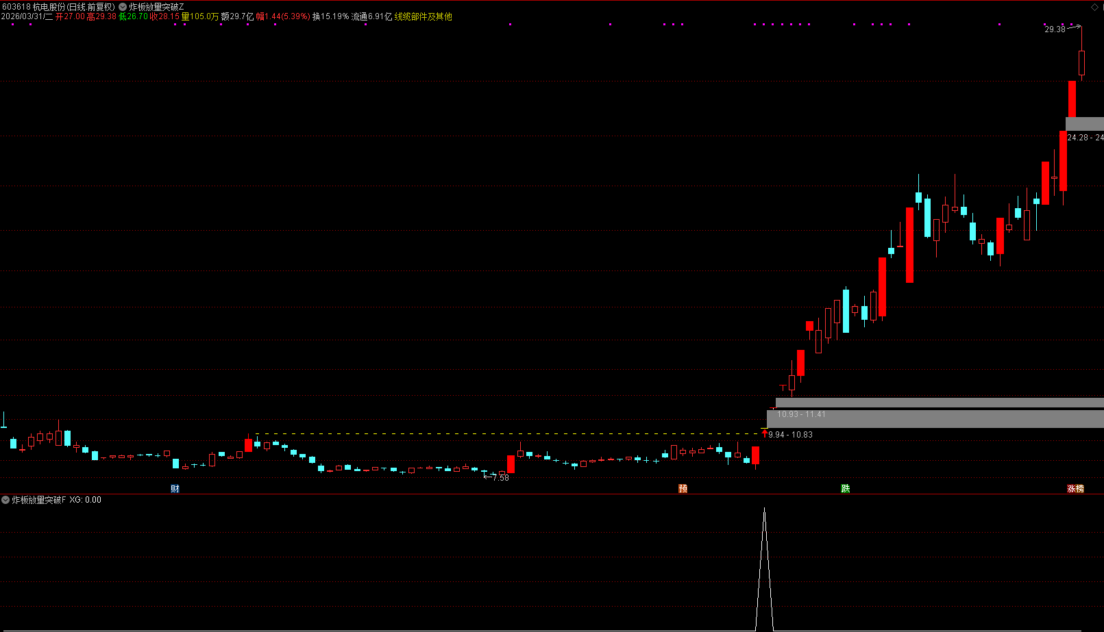 黄色虚线会自动标记炸板当日的高点水平压力位,而红色箭头则精准提示突破信号,这就是选股和入场的黄金位置。