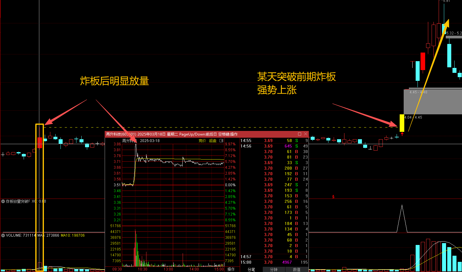 本模式的核心逻辑在于成交量的显著放大,这通常是主力资金深度介入的信号。特别是在涨停后出现炸板并伴随巨量成交,更是主力刻意试盘或换手的明显动作,该位置往往构成了后续行情的关键信号位。