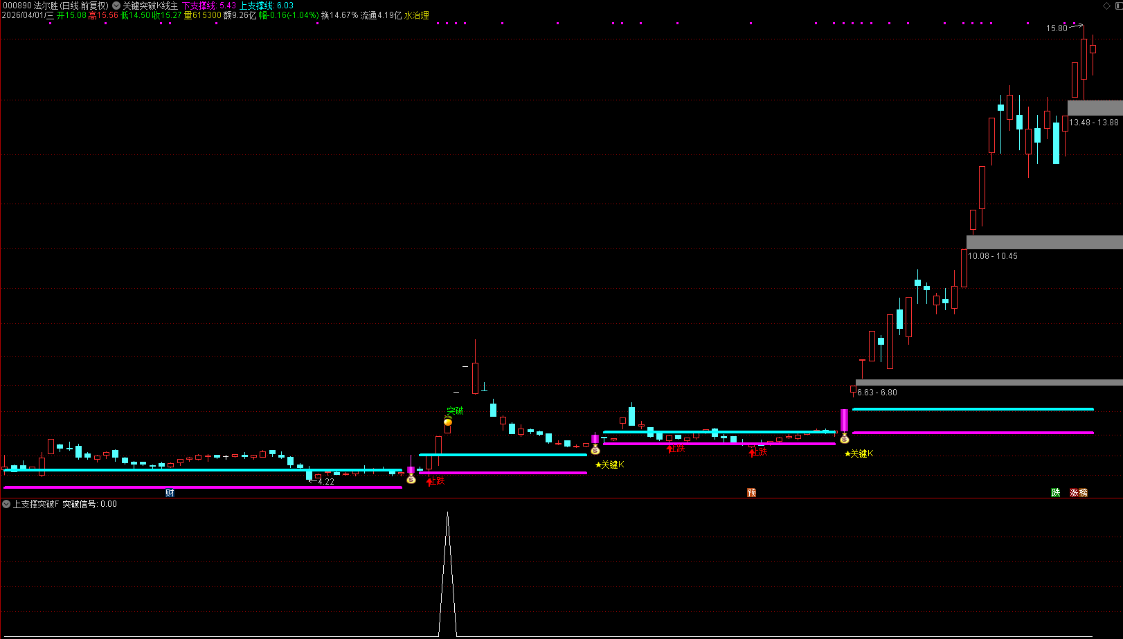 指标的核心功能是捕捉股价在关键位置出现放量突破时产生的买入信号。它通过识别主力资金建仓或试盘时留下的特殊K线,并以此为基准画出一条支撑线。当股价后续放量上涨,强势突破这条支撑线并创下近期新高时,指标便会发出“突破信号”。