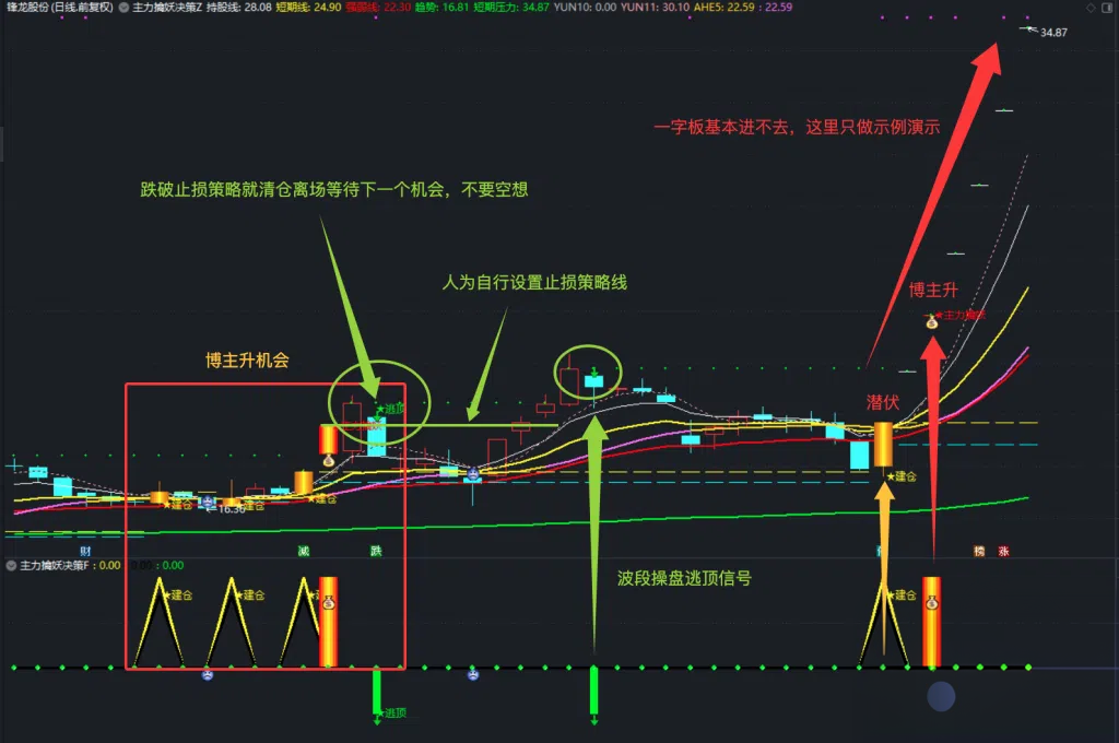 • 核心功能:综合显示趋势、支撑压力位及四大决策信号(抄底、建仓、擒妖、逃顶)。
