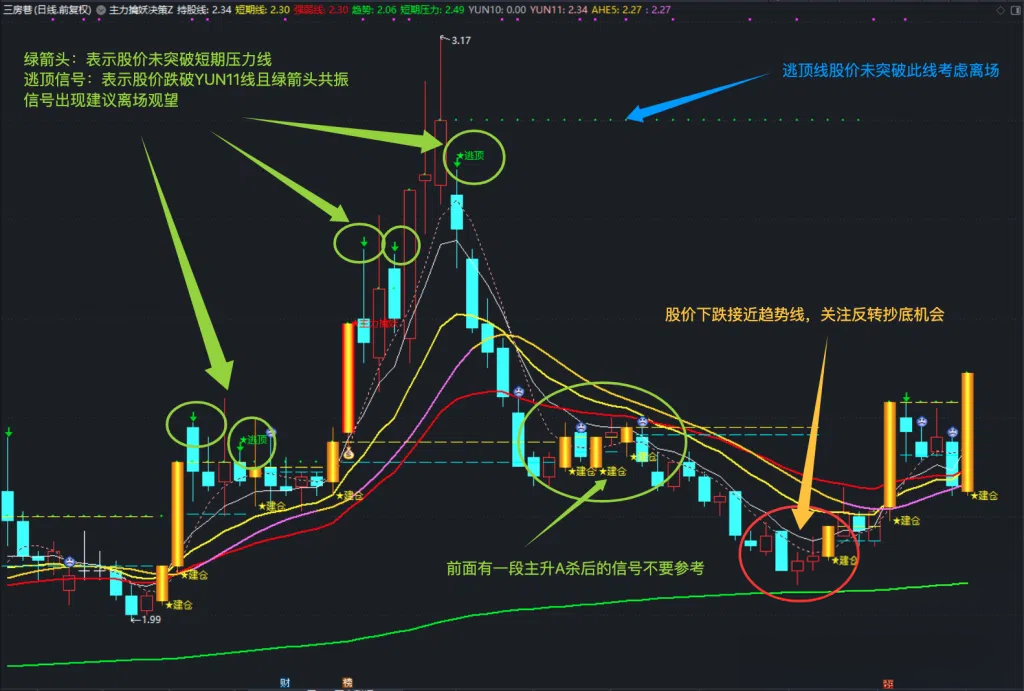 • 逃顶信号(TYJC):价格下穿短期压力线或出现背离,标识为绿色箭头。