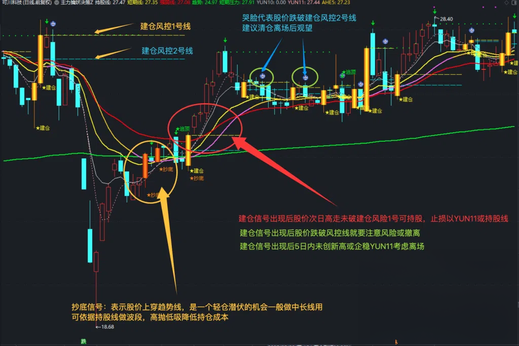 短线操盘:以持股线为基线,股价在YUN11之上持股拥有,股价跌破持股线就离场; 博主升机会操盘:以『主力擒妖』信号为基础信号,做好止损以最高或最低做风控线(也可按自已操盘风格自行定义风险标准),股价跌破主力擒妖风险高位线或五日内不上涨或滞涨就离场;这个操盘风险较高,严格设置止损策略! 建仓信号博短线机会:以持股线为基线,yun11线为操盘线,建仓信号为基础信号,建仓信号两条虚线(黄色与青色虚线)为风控线,信号发出后股价5日内未企稳YUN11线就一址持股,股介跌破持股线或风控1号线黄色虚线注意风险,跌破2号风控线(青色虚线)即哭脸图标信号就考虑清仓离场;