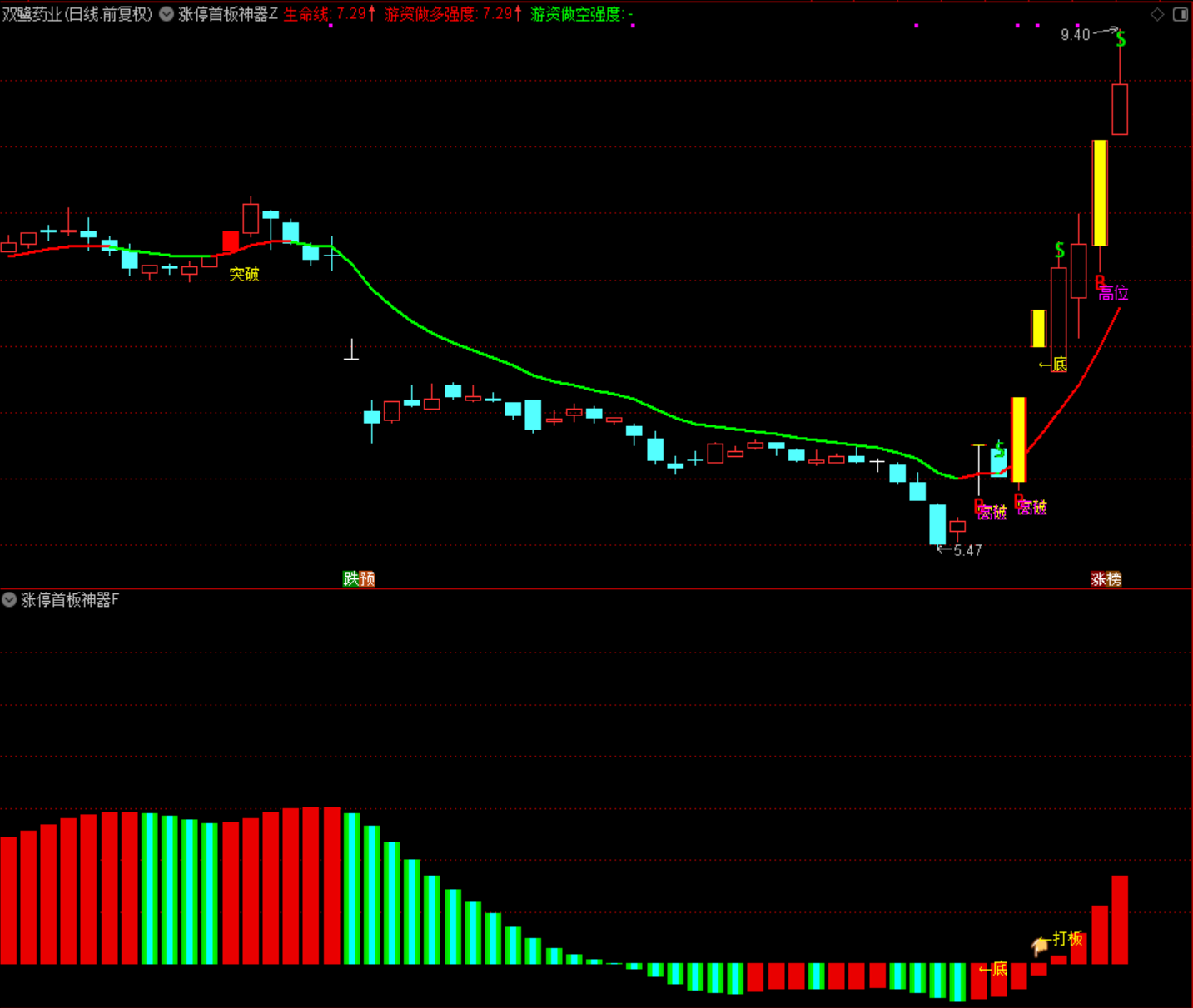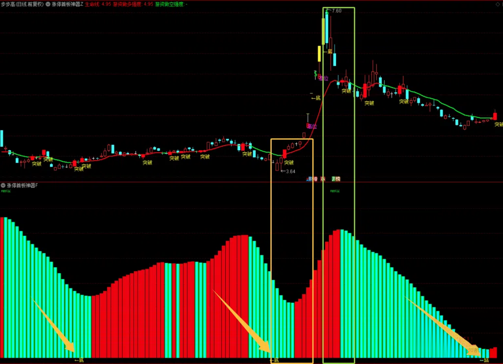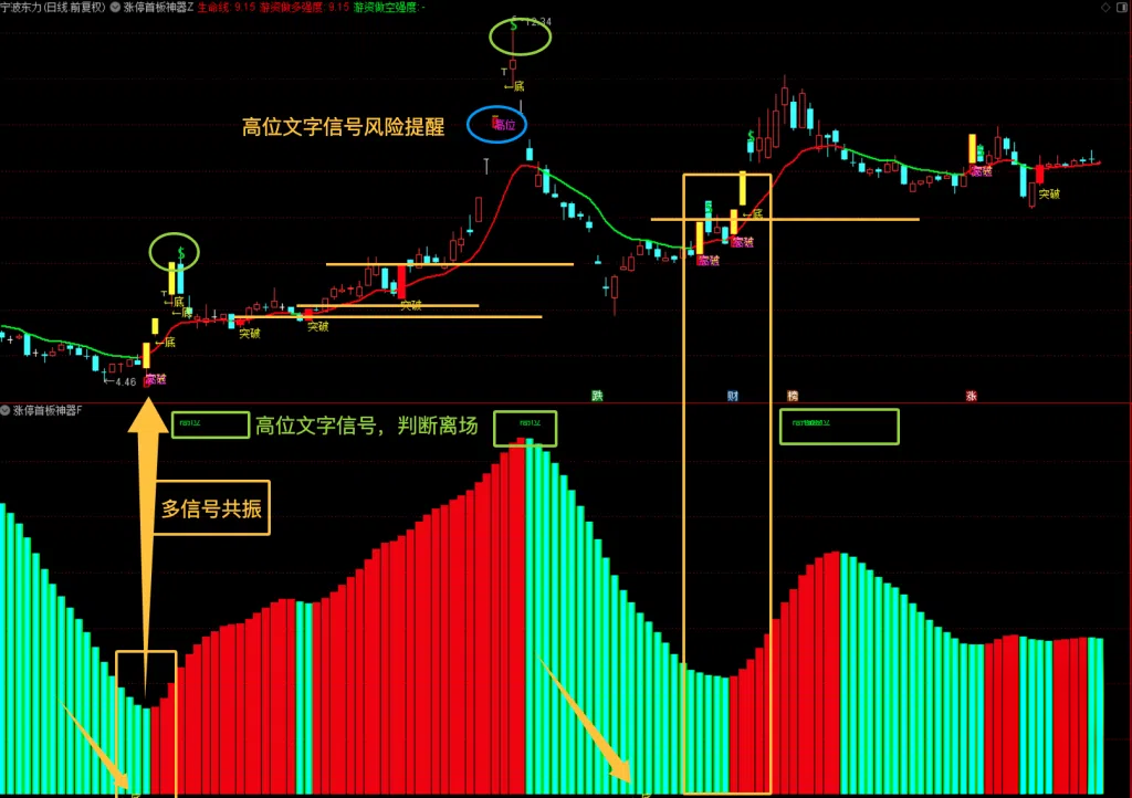 共振原理:当主图B点与副图”打板”金手指信号指标同步出现时,构成顶级买点组合