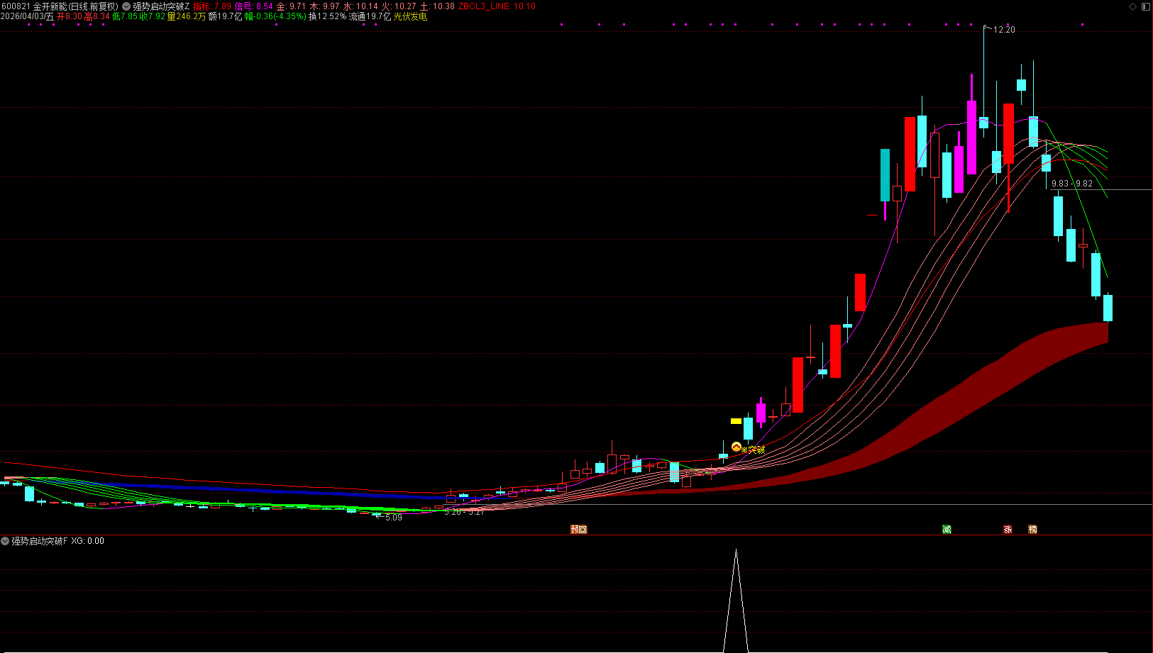 多层均线多头排列,趋势强度直观可见,拐头变绿自动提示走弱。
