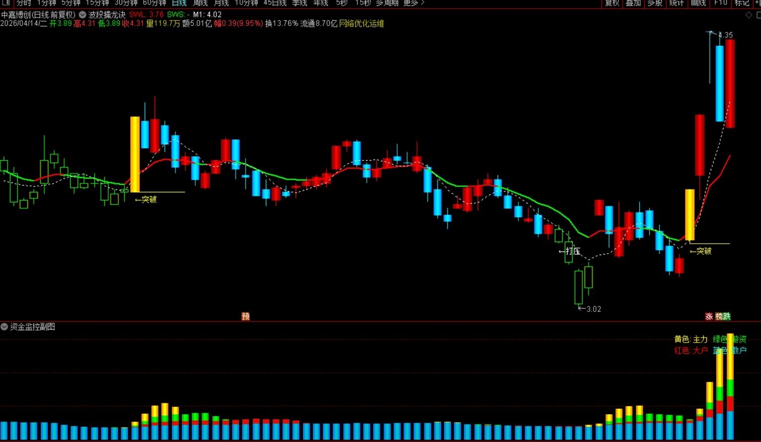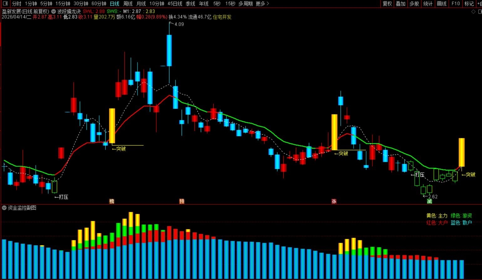 ( 通达信〖波段擒龙诀〗主图+〖资金监控〗副图 监控不同资金博弈情况)