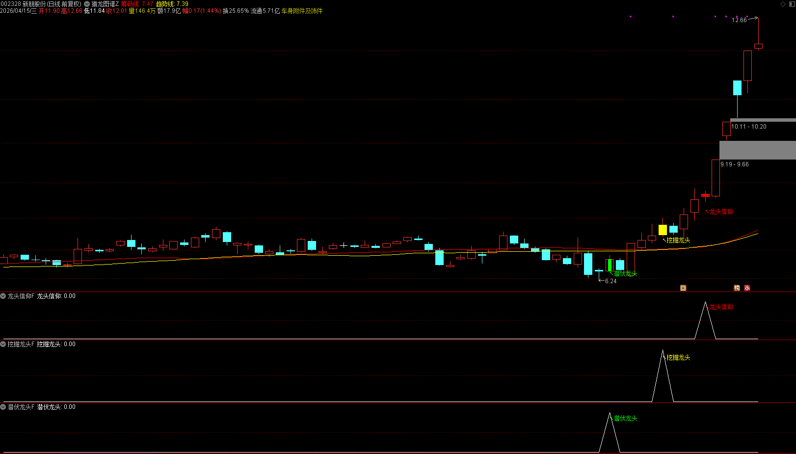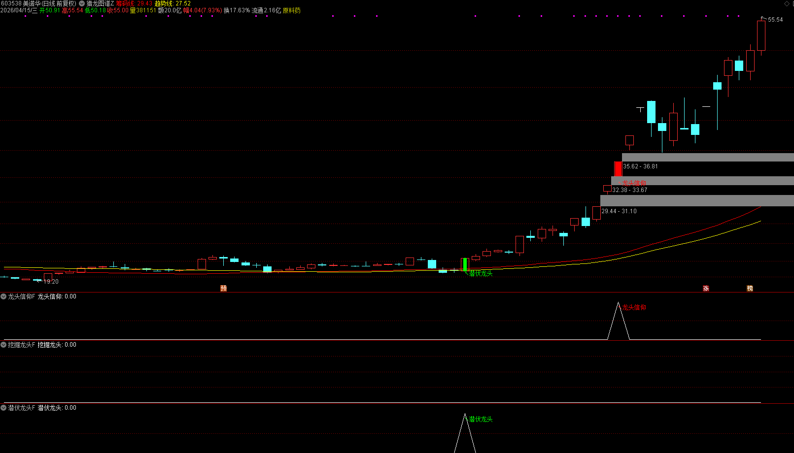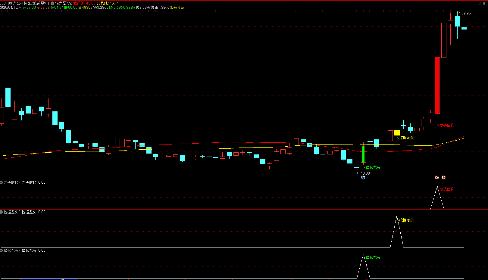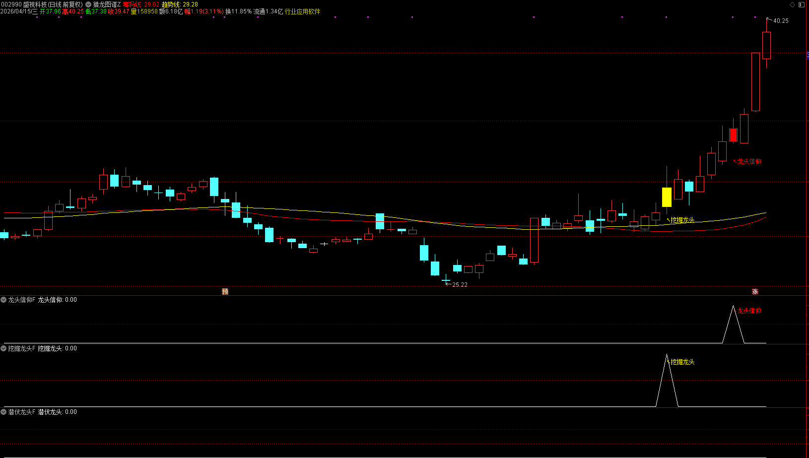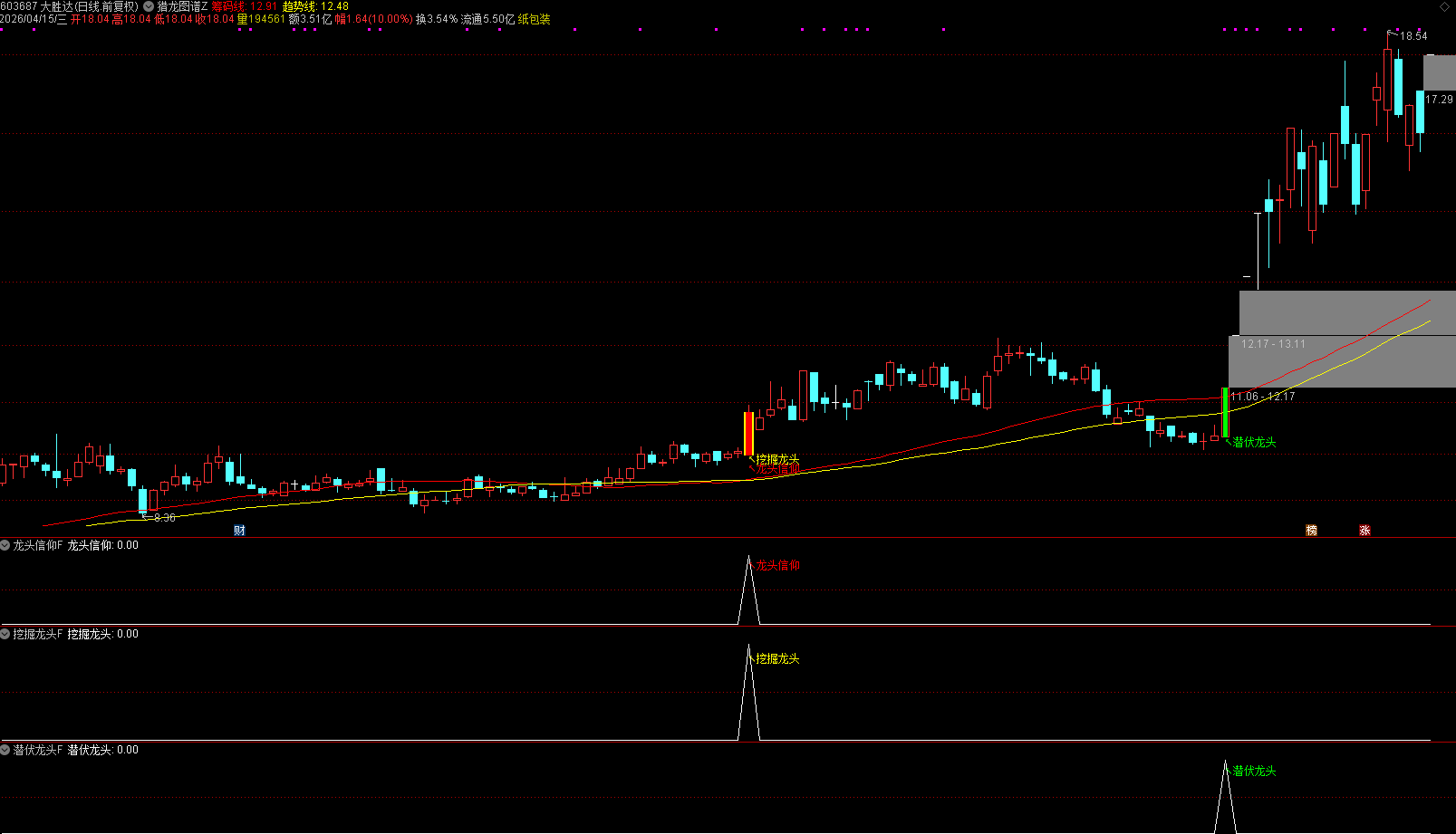 当主图出现“挖掘龙头”或“龙头信仰”黄色/红色文字提示,且伴随黄色/红色K线加粗时,是极佳的右侧买入点,通常意味着主升浪加速。