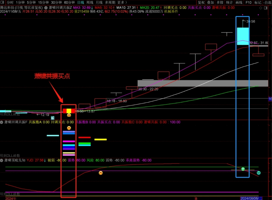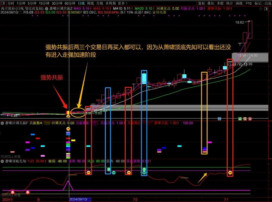 3.强势走强阶段,多种精品指标的强势共振买点,即萧啸共振,分为强势共振买点和萧啸共振买点,区别在于【萧啸顶底先知】是否出现强势信号,在这三个买点中胜率相对最高。