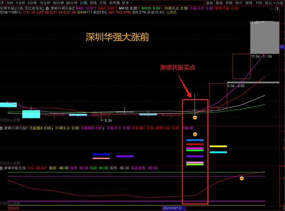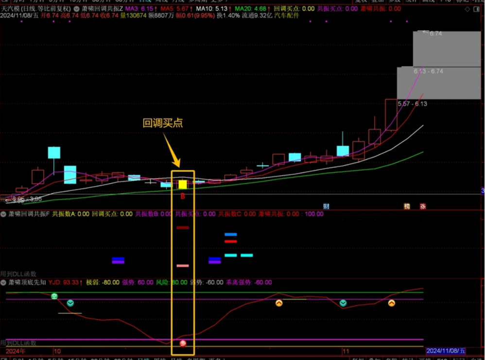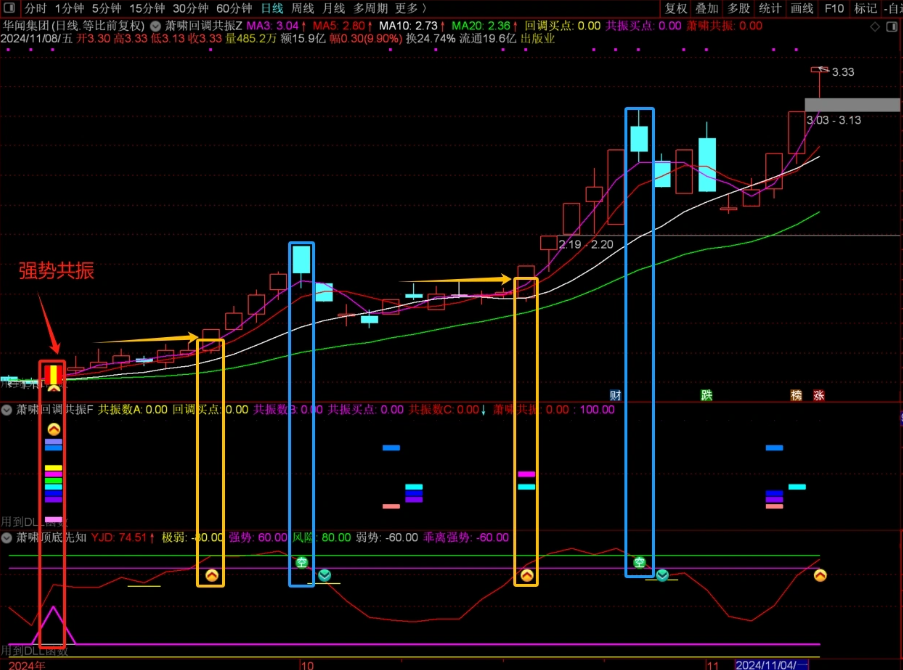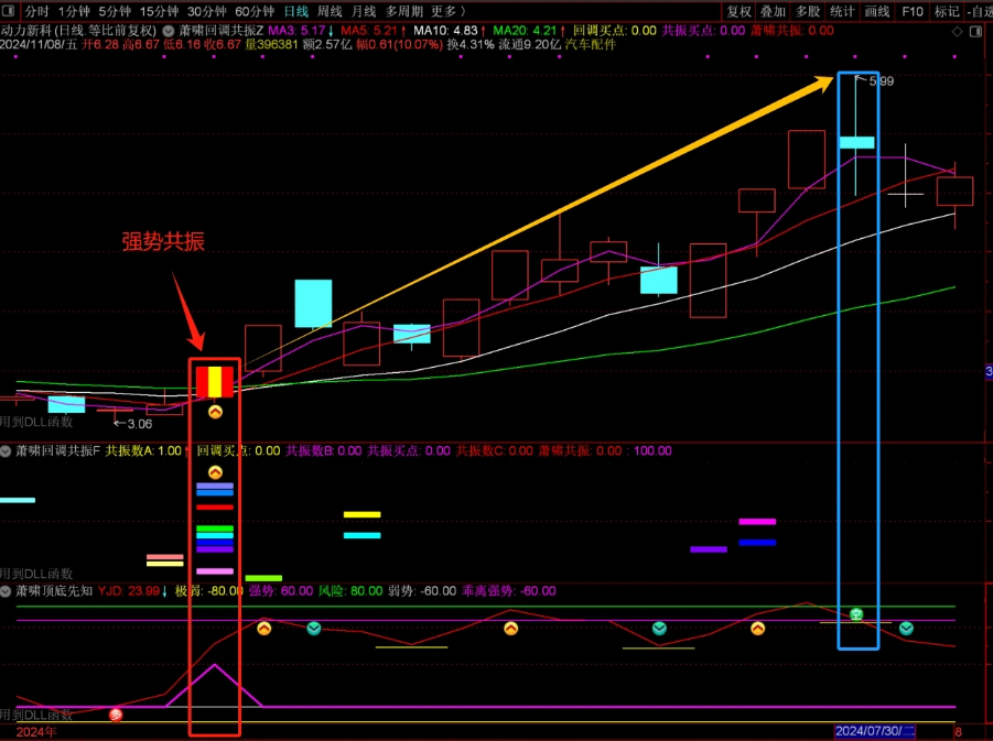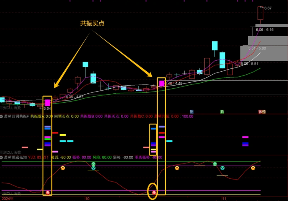 二、俗话说共振出大牛!我们知道,很多牛股妖股都是在多种指标共振后走出来的。所以,在2024年双十一到来之际,萧哥重磅推出【萧啸回调共振】这套指标组合!为了让大家能从容上车并且及时下车,萧哥还特意把【萧啸顶底先知】加入了这个指标组合中。