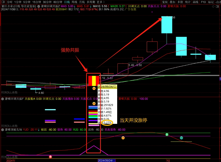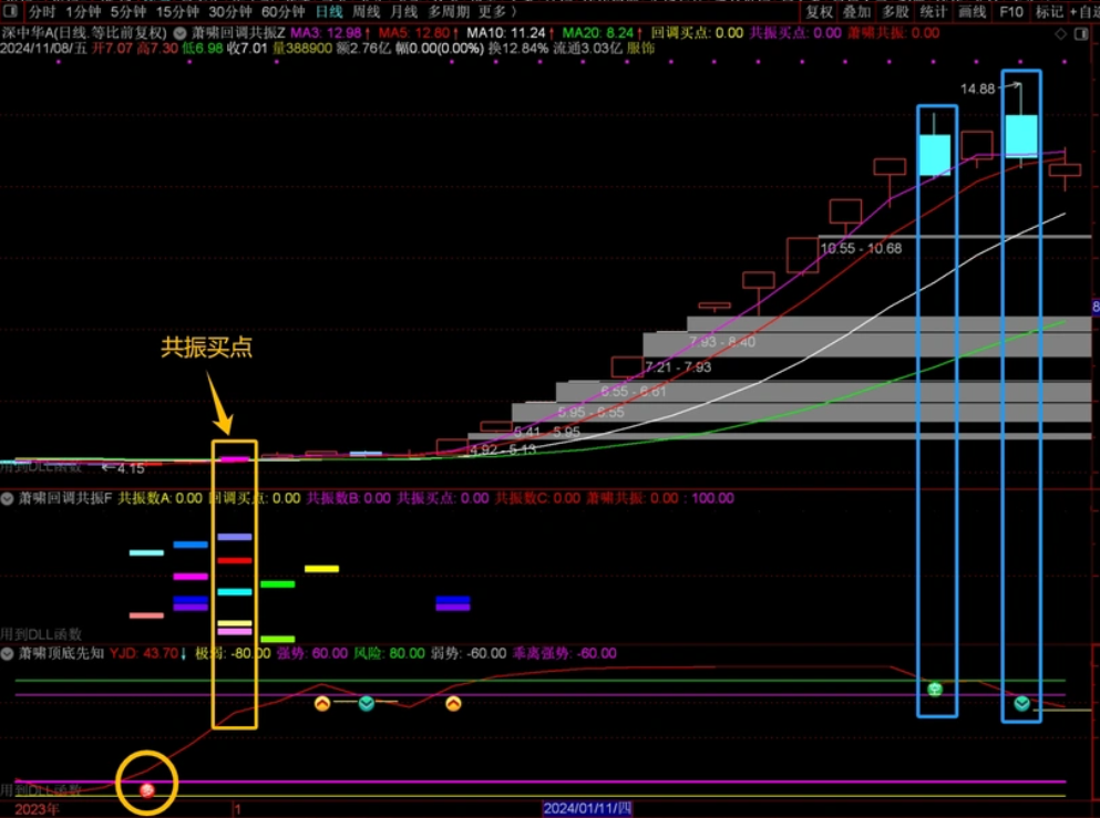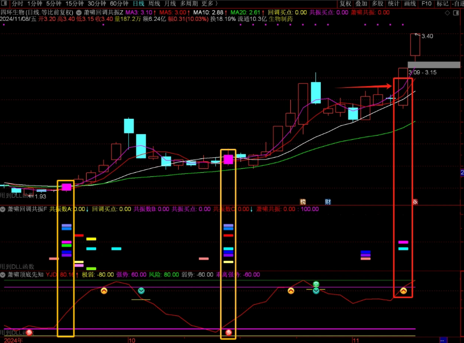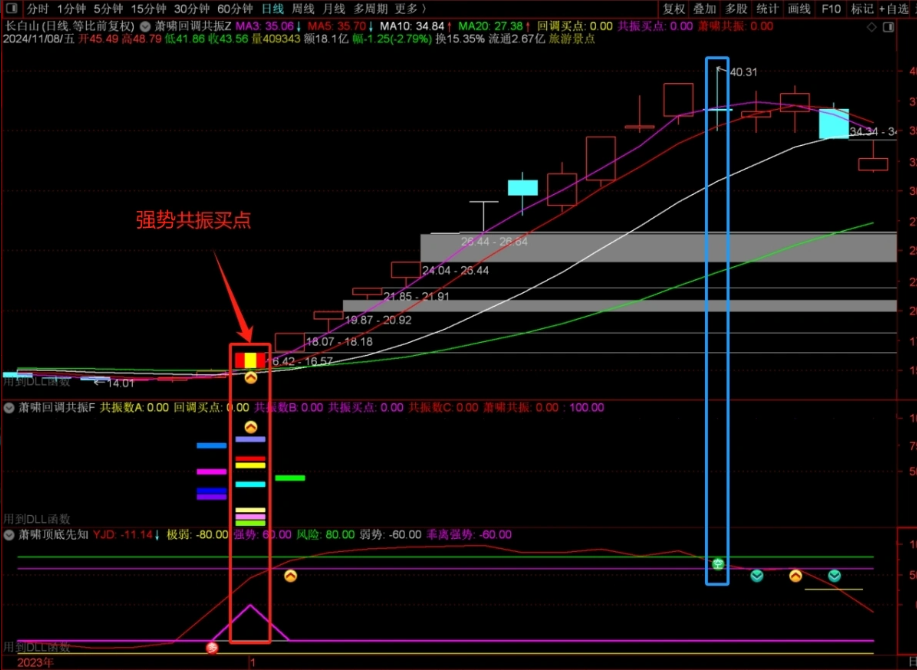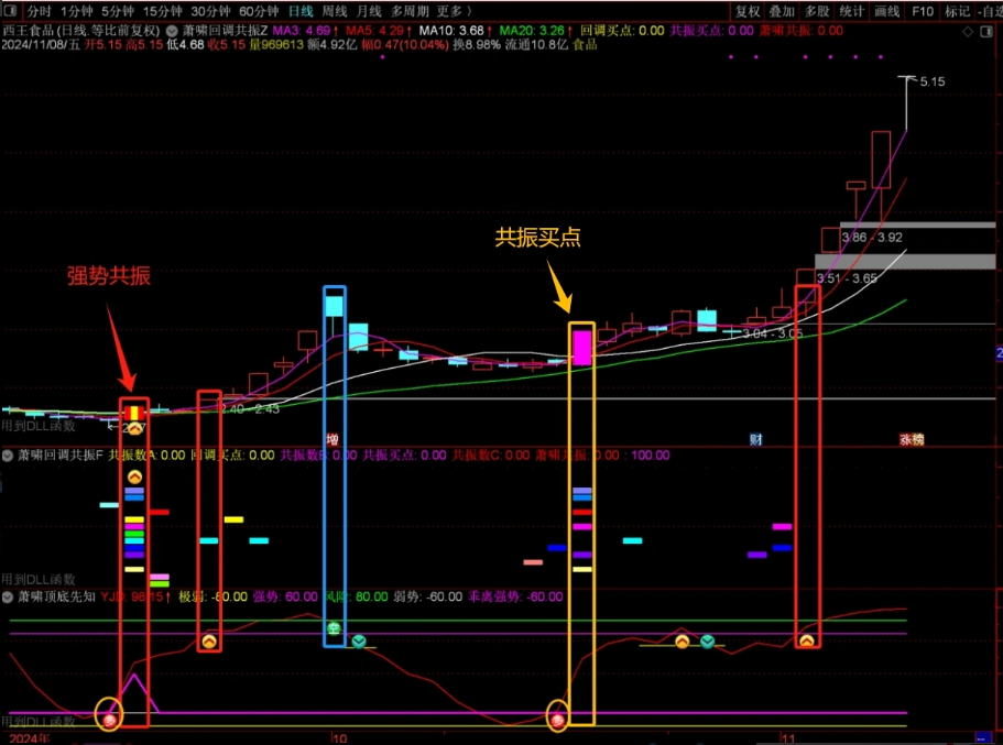 二、俗话说共振出大牛!我们知道,很多牛股妖股都是在多种指标共振后走出来的。所以,在2024年双十一到来之际,萧哥重磅推出【萧啸回调共振】这套指标组合!为了让大家能从容上车并且及时下车,萧哥还特意把【萧啸顶底先知】加入了这个指标组合中。