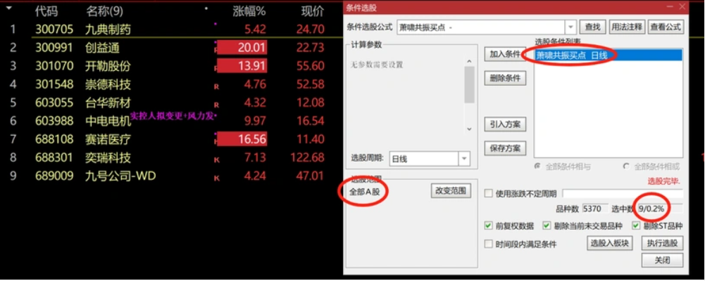 由于选股方案用到了十多种指标共振选股,所以选股时间相对较长,不太适合用于盘中预警;如果盘中时间充足,可以选股;如果盘中时间不够就最好用于盘后选股。