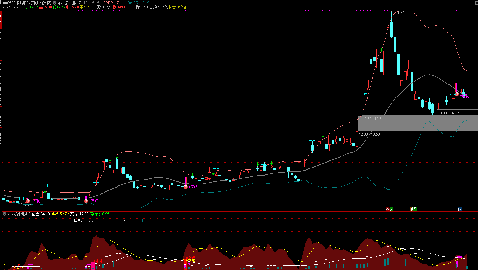 6.、开口信号→布林带开始扩张,等待启动提示;