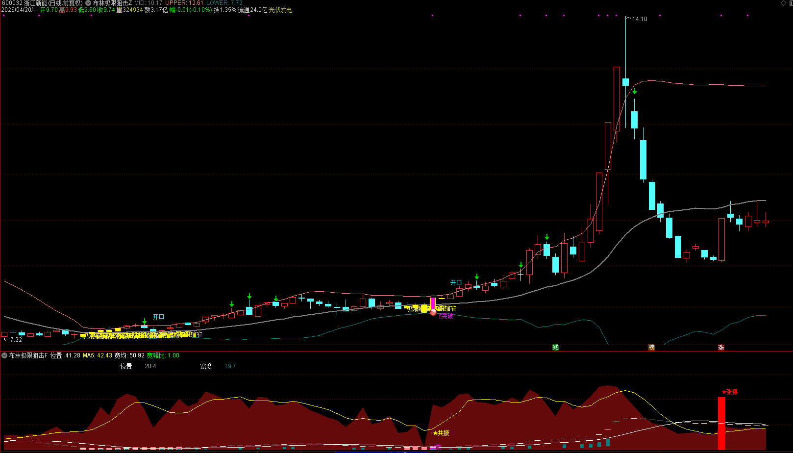 核心原理:当布林带宽度持续收窄、小于阈值并低于均宽时,说明波动枯竭、抛压耗尽,主力即将选择方向。配合放量、阳线、涨停等信号,精准捕捉主升浪启动点。