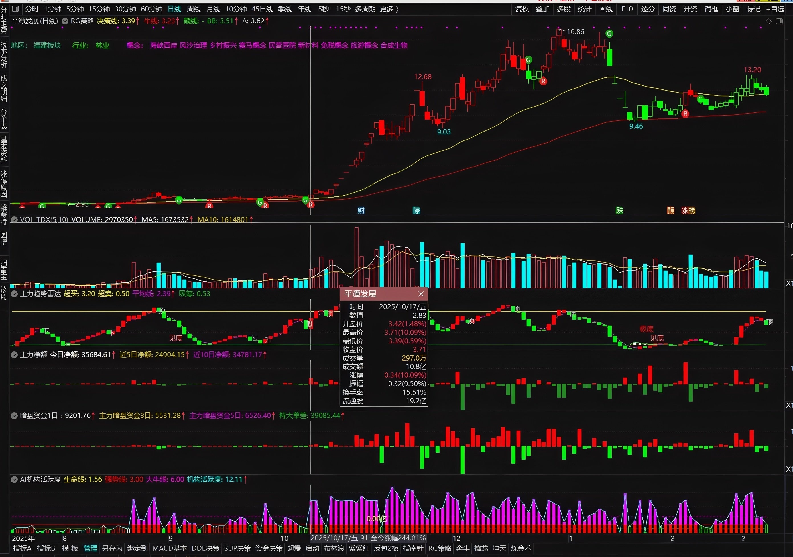 趋势、波段、资金、量能、活跃度,这五者共同构成了某花顺付费决策体系,其核心逻辑是通过“趋势定位+资金验证”的组合拳,帮助投资者从“看K线猜涨跌”升级为“看资金做趋势”。现完美移植到通达信,因通达信主图信号没有G、S图标,用R、G图标替代,也称为RG策略。