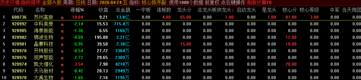 本公式根据网络大神的经典视频和语录进行的总结,分辨出各种市场中各种股票的明确定义。明确一个关键的问题,为什么有些板块上涨而板块内很多股却不涨,而有些股却能持续的上升呢?那是因为市场的5000只票里,资金关注的个股永远就是龙头,核心,中军,抱团,除了这些股以外不就都是跟风和杂毛票。该公式基本解决了个股在板块内的定位,确定了每一波板块或市场上涨中的个股的地位。
