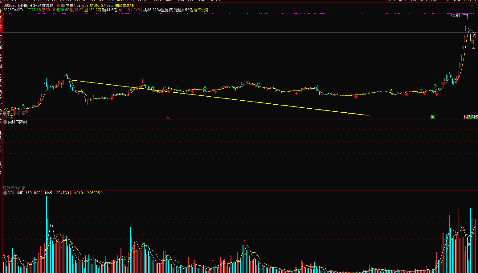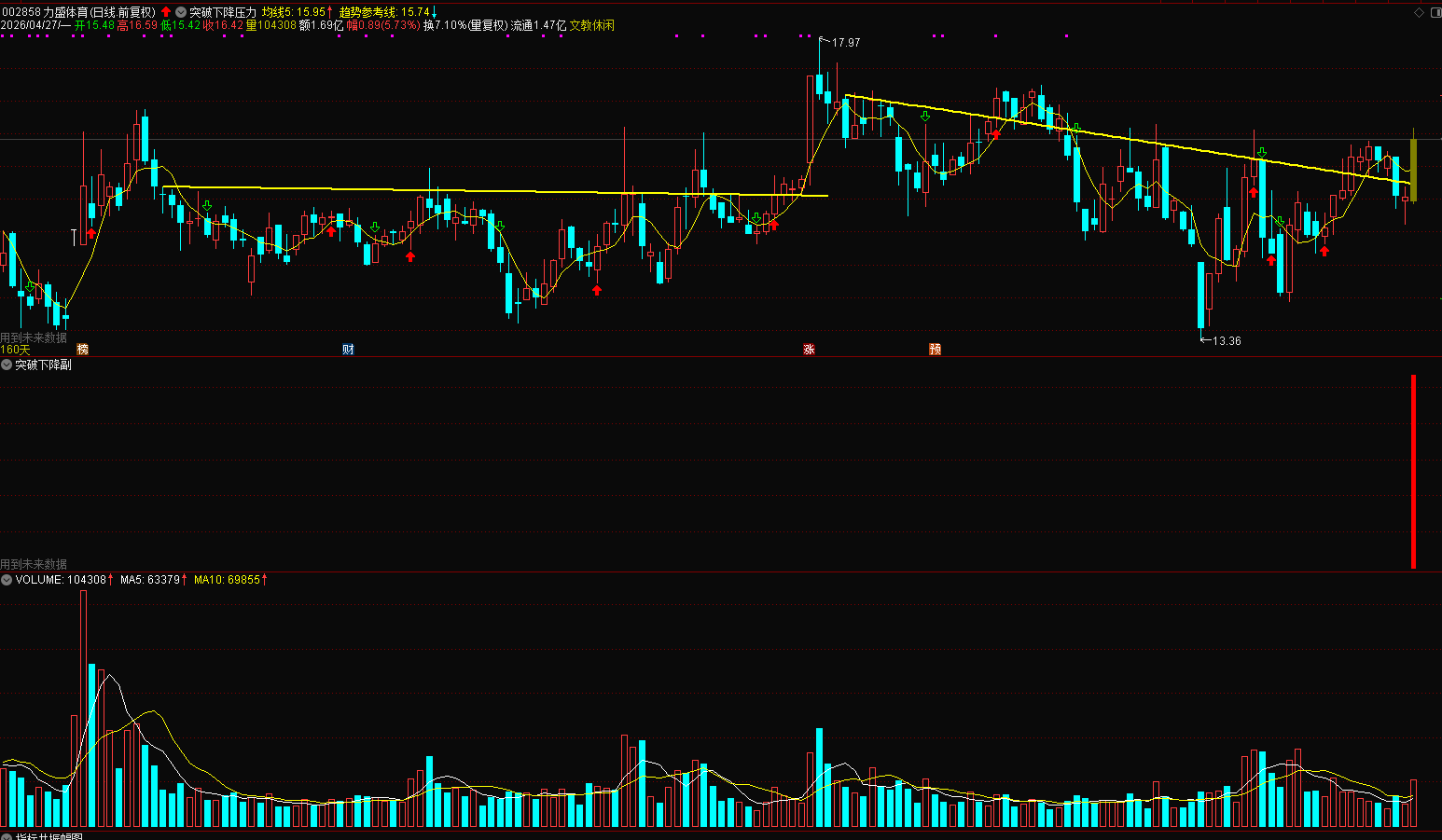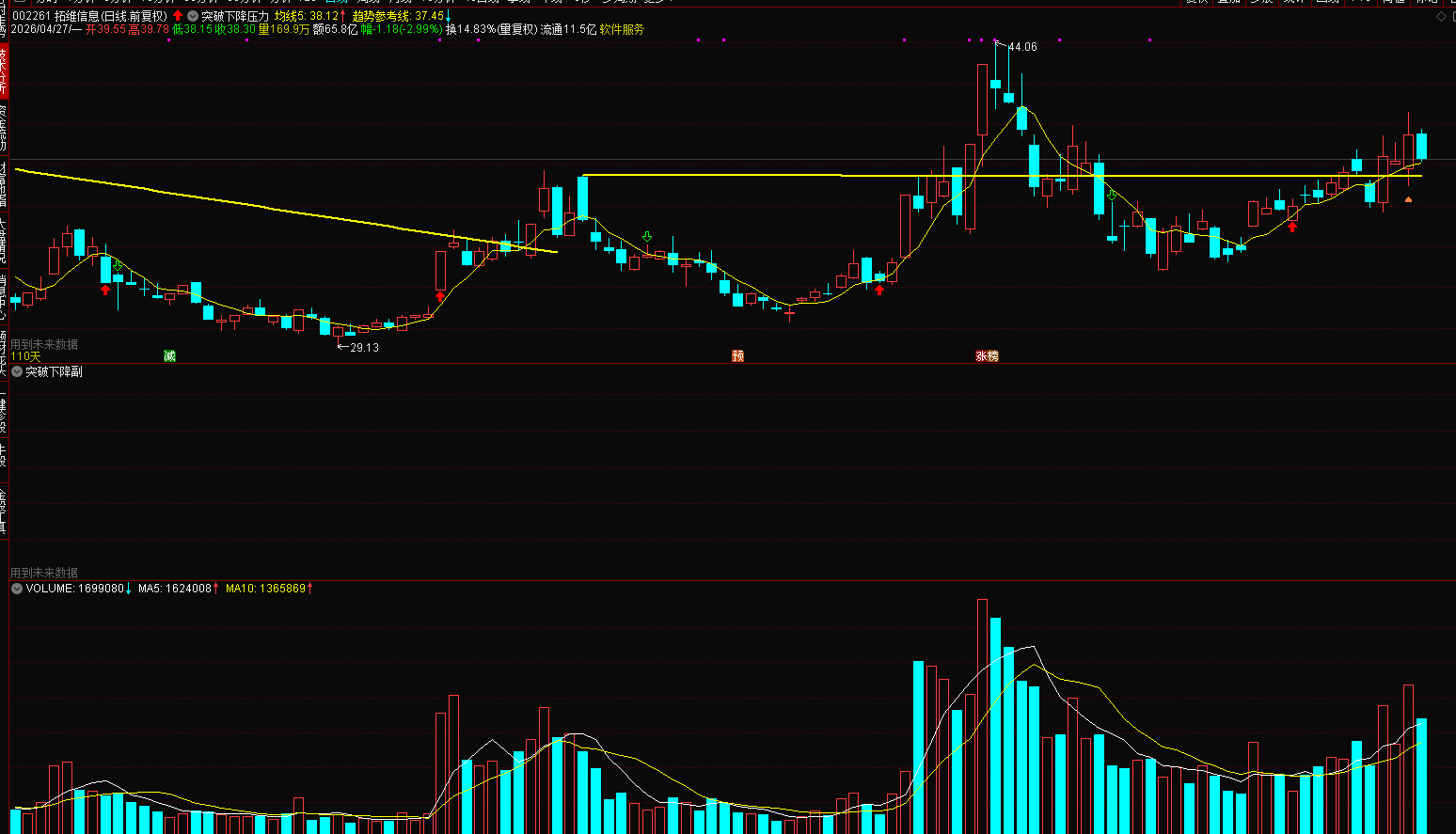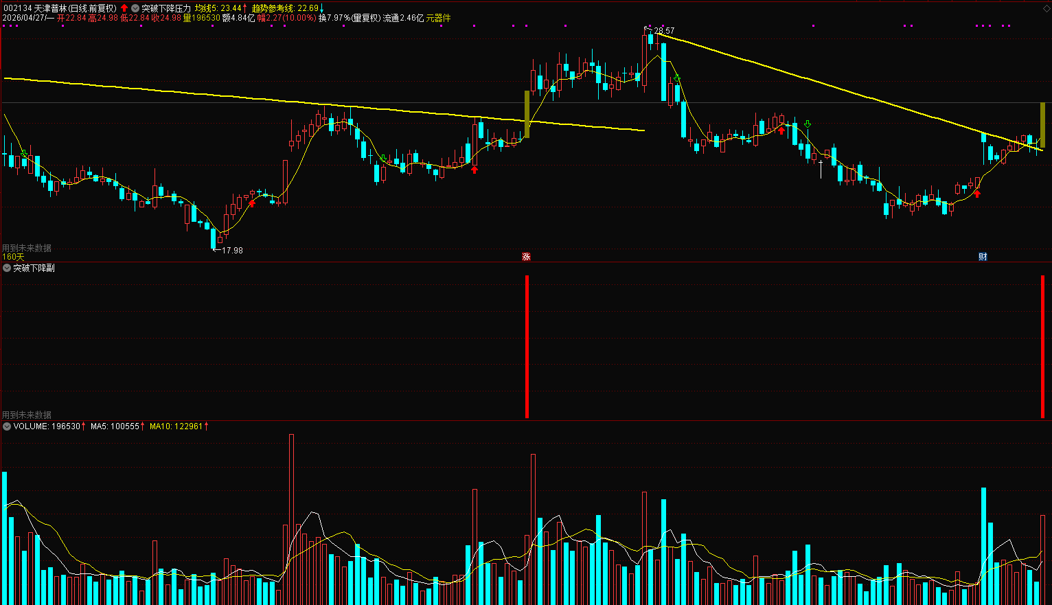 (通达信突破下降压力位主副图选股指标公式)