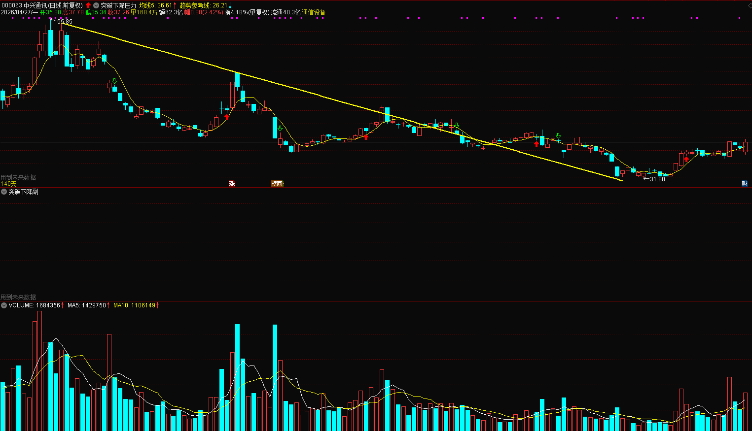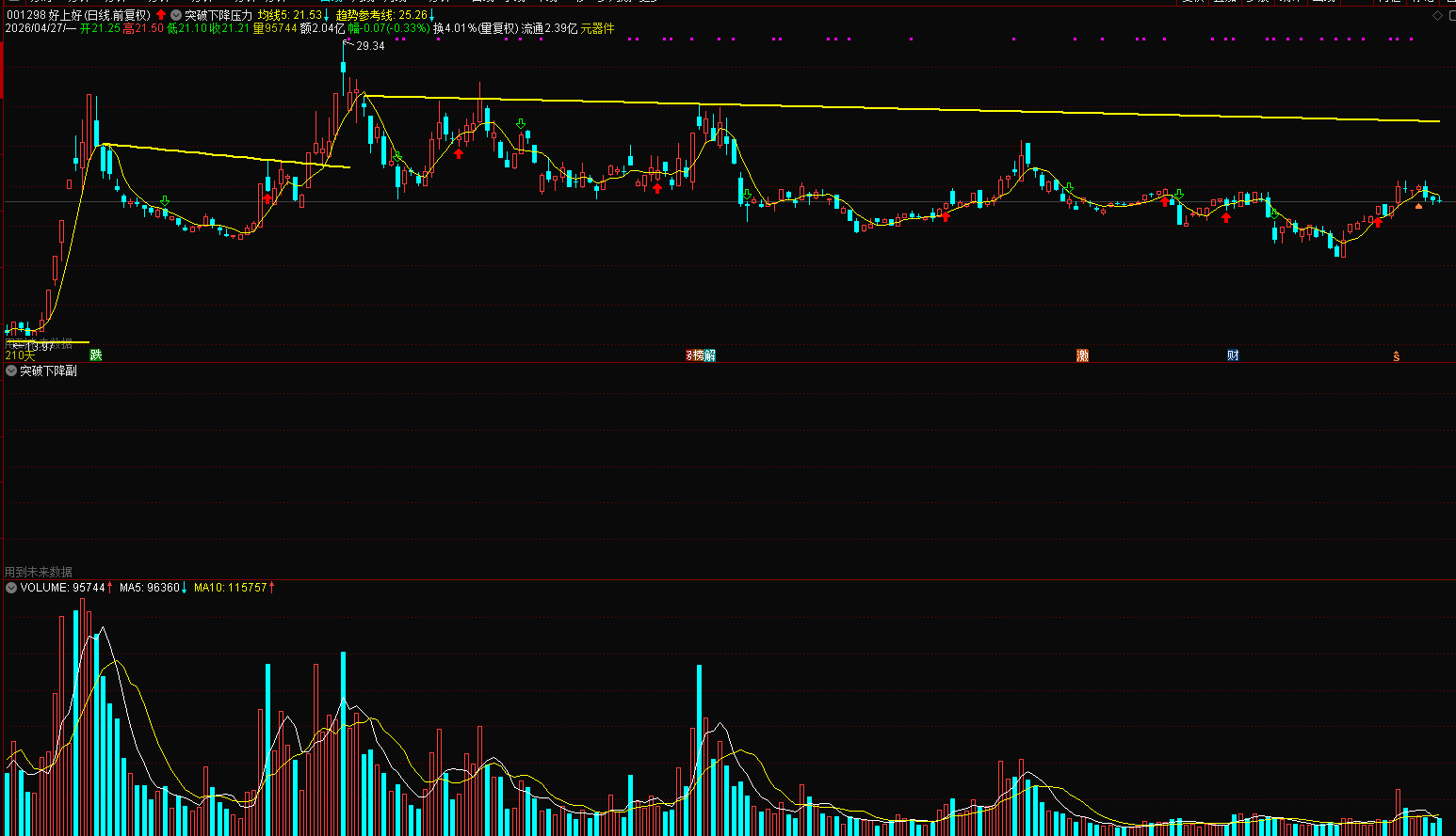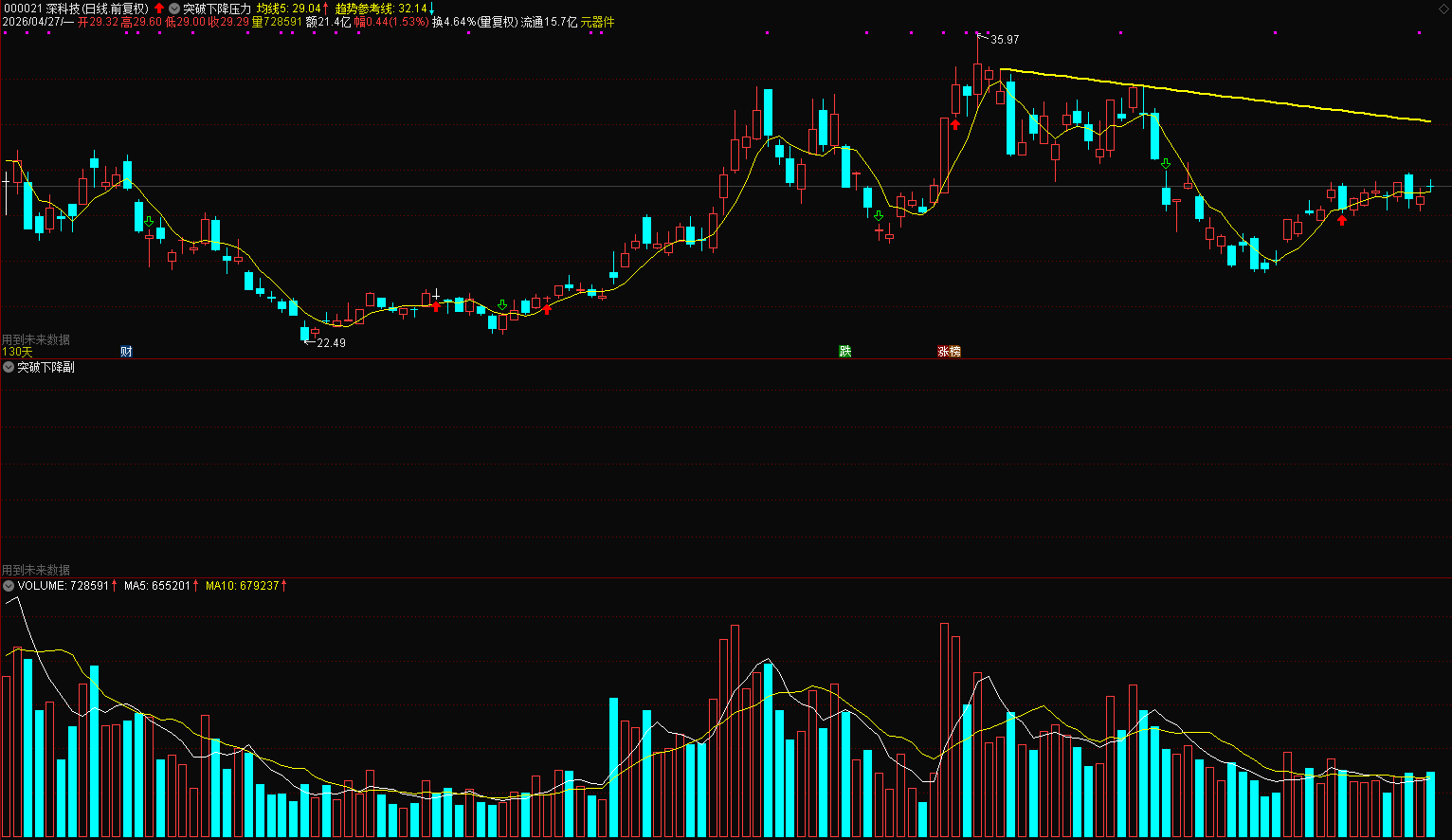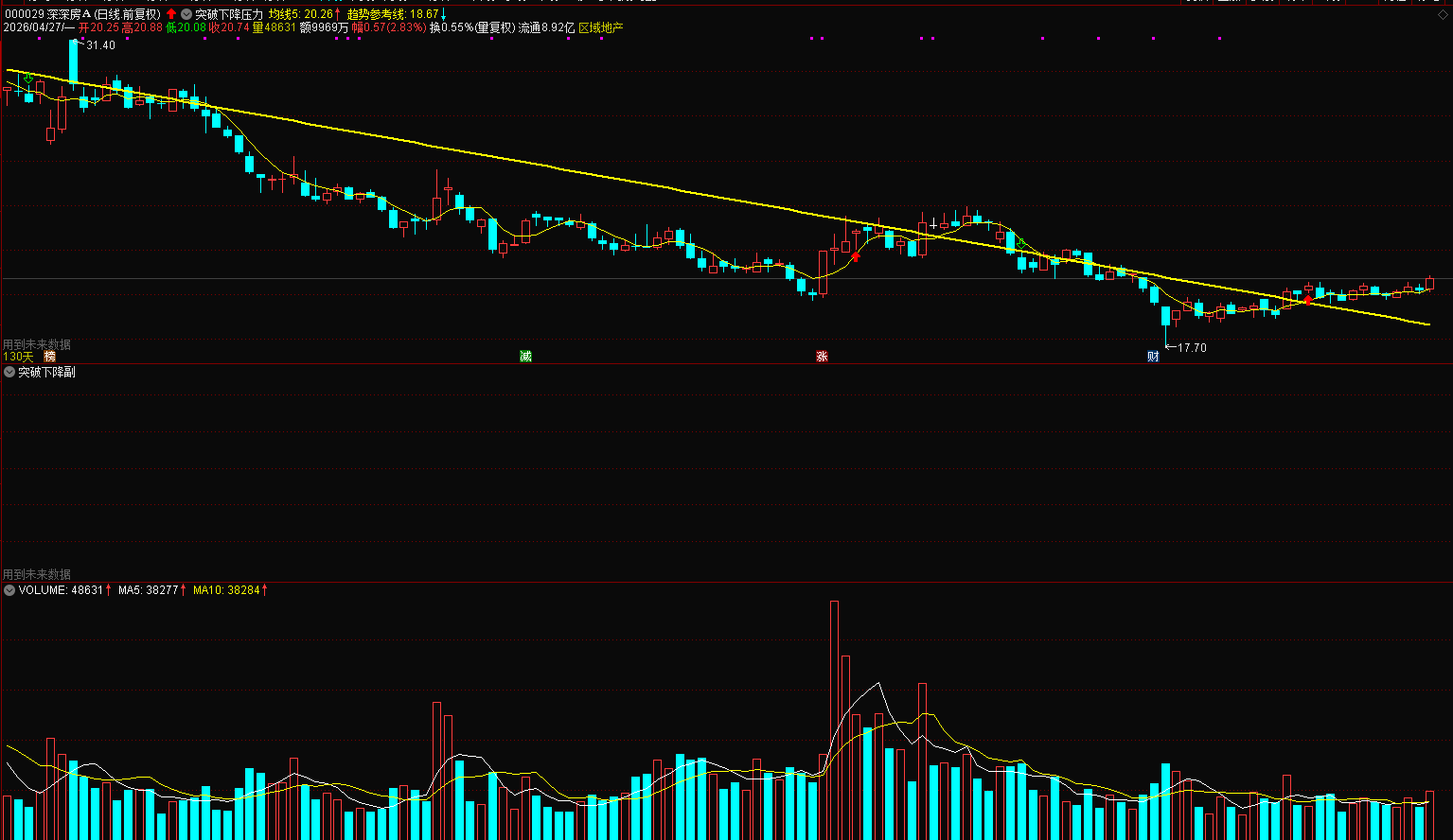 下降压力位:下跌过程中连续反弹高点连成的阻力线,是长期空头抛压、套牢筹码集中区。
