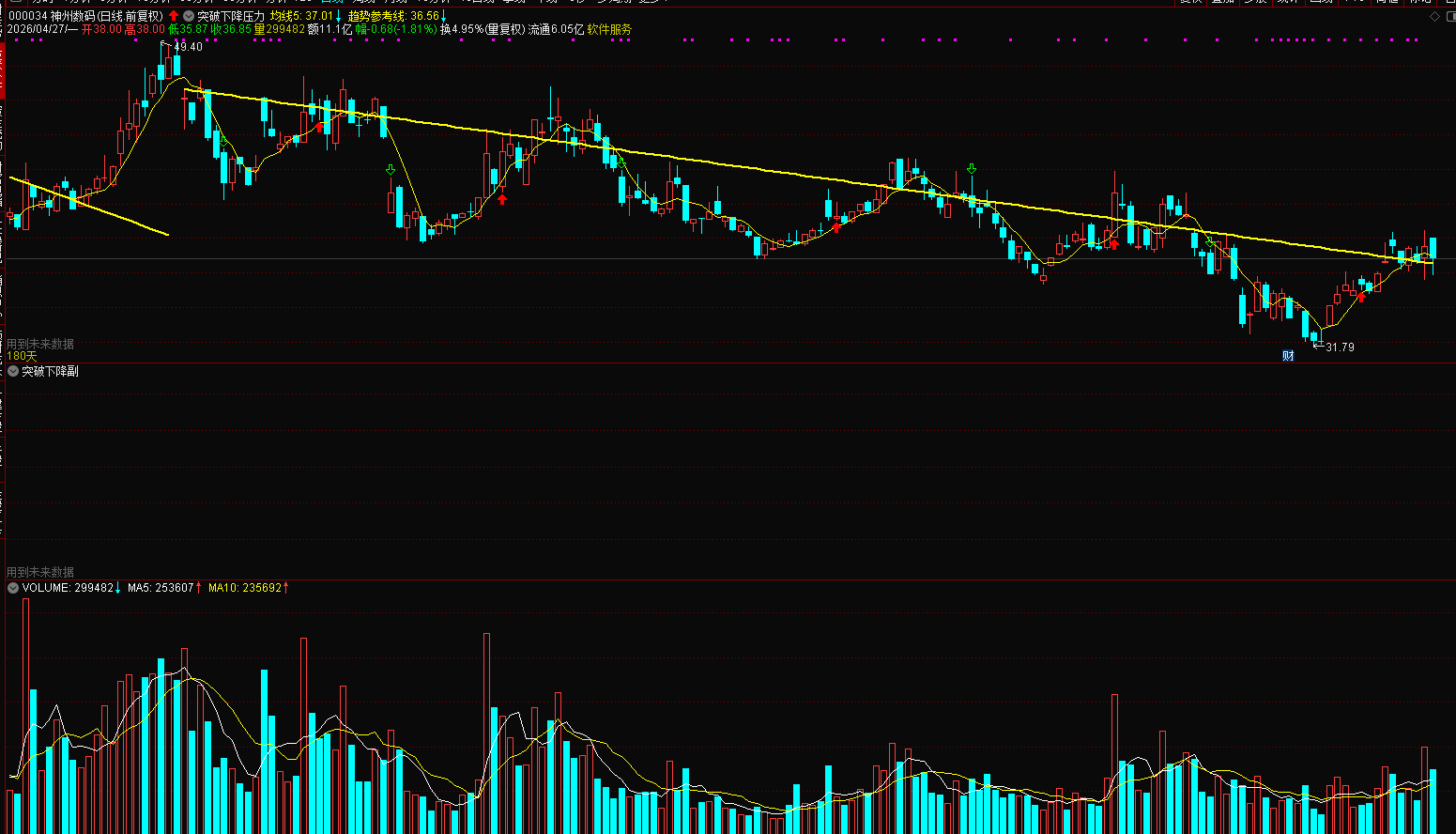 指标是会出现说如果看不到 线的话,可能这个线在前面的问题,不一定说一定会绘制到近期,所以大家请明白,例如图下: