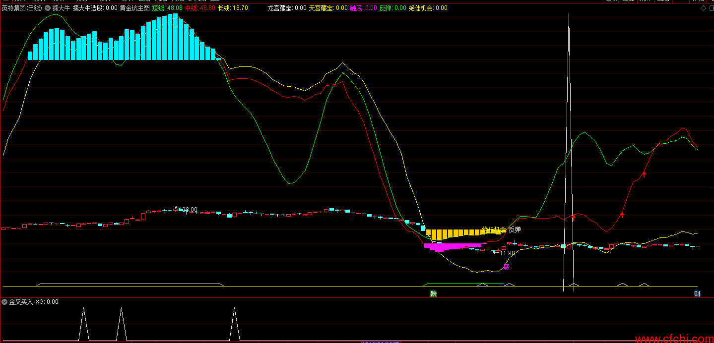 绝佳机会:CROSS(短线,长线)AND 长线<18 AND 长线>REF(长线,1)OR CROSS(长线,5),COLORYELLOW;