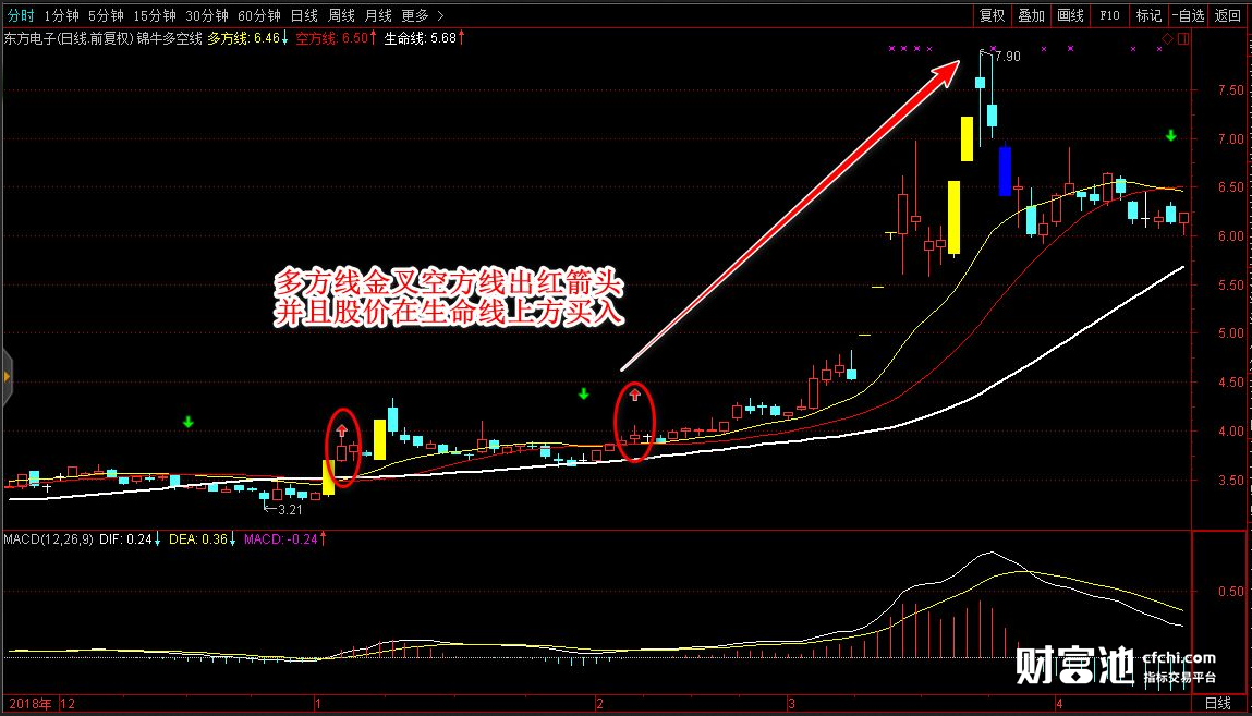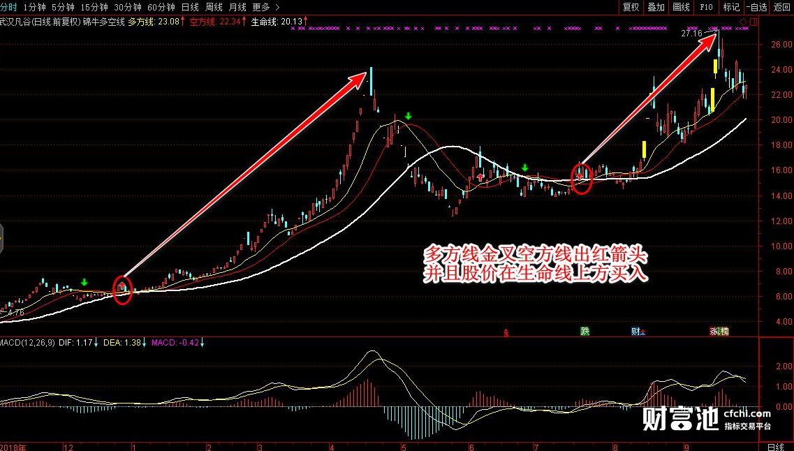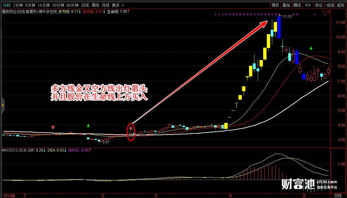 买点:多方线金叉空方线出红箭头,并且股价位于生命线上方就是买点,可以考虑买入。