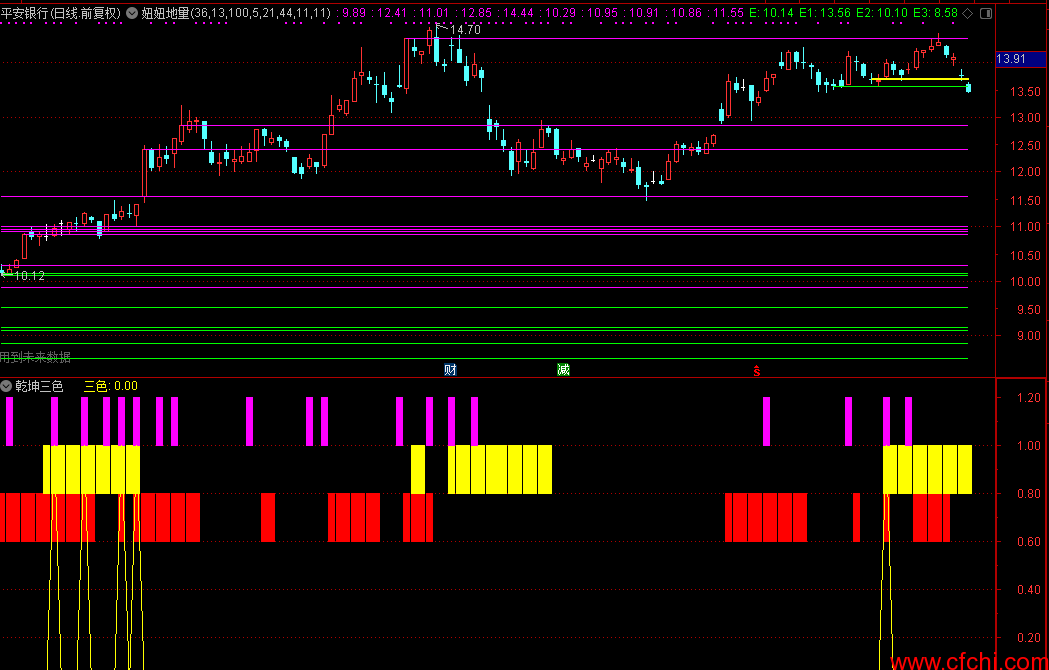 枚红色水平画线表示阳量 绿色水平画线表示阴量,黄色加粗水平画线表示阴量最高画线。根据画线可以参考N周期阳量 阴量集中在哪个价位,参考买进 卖出