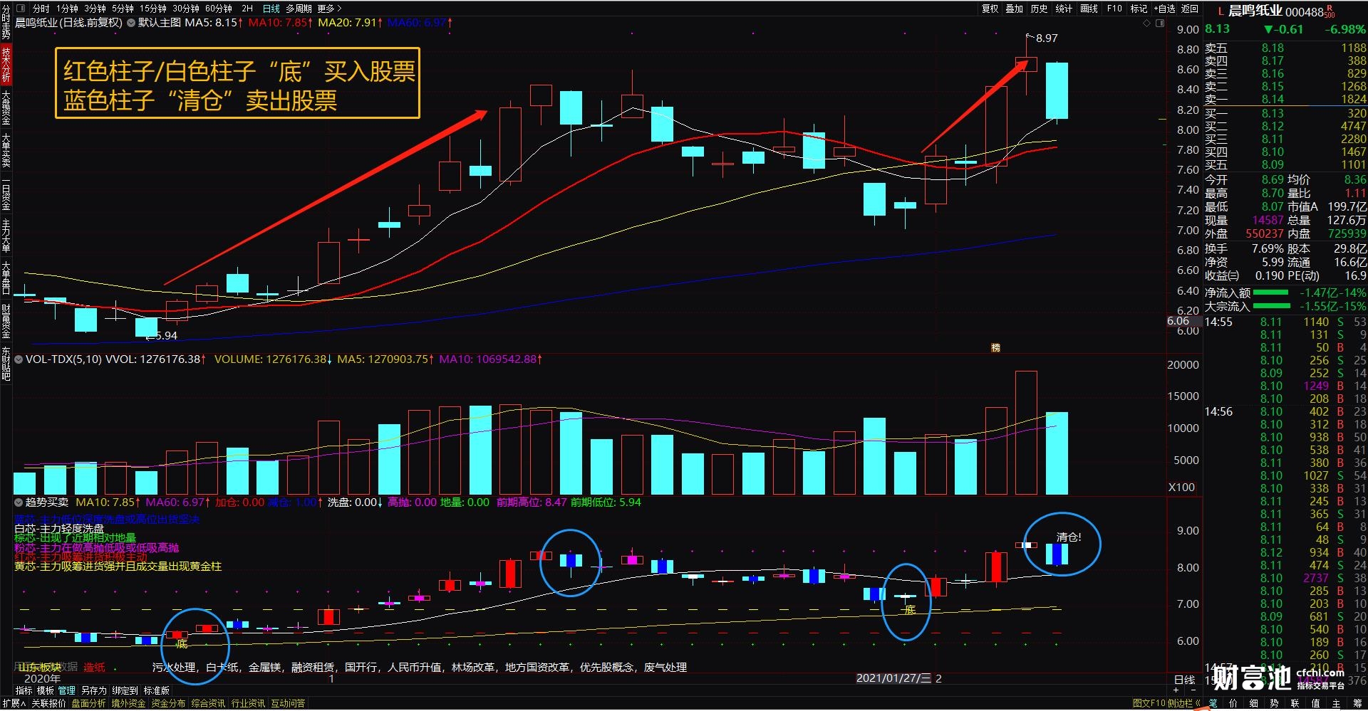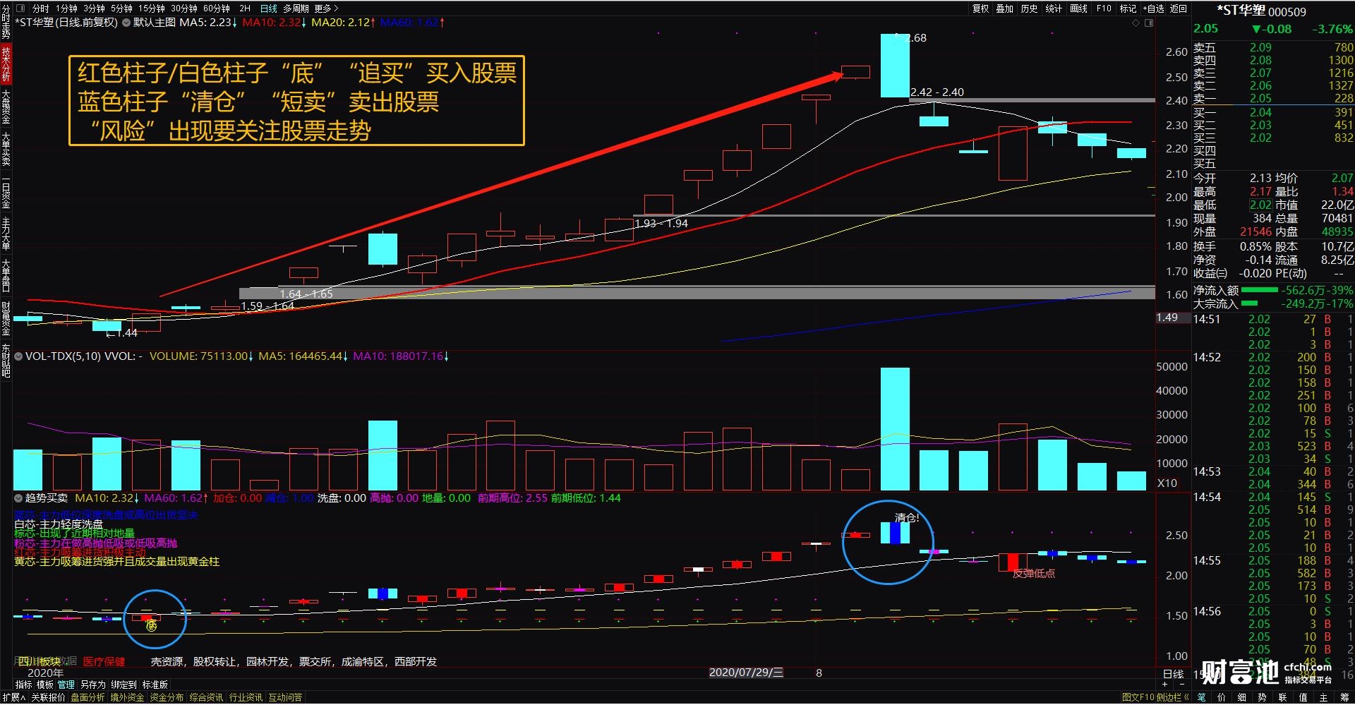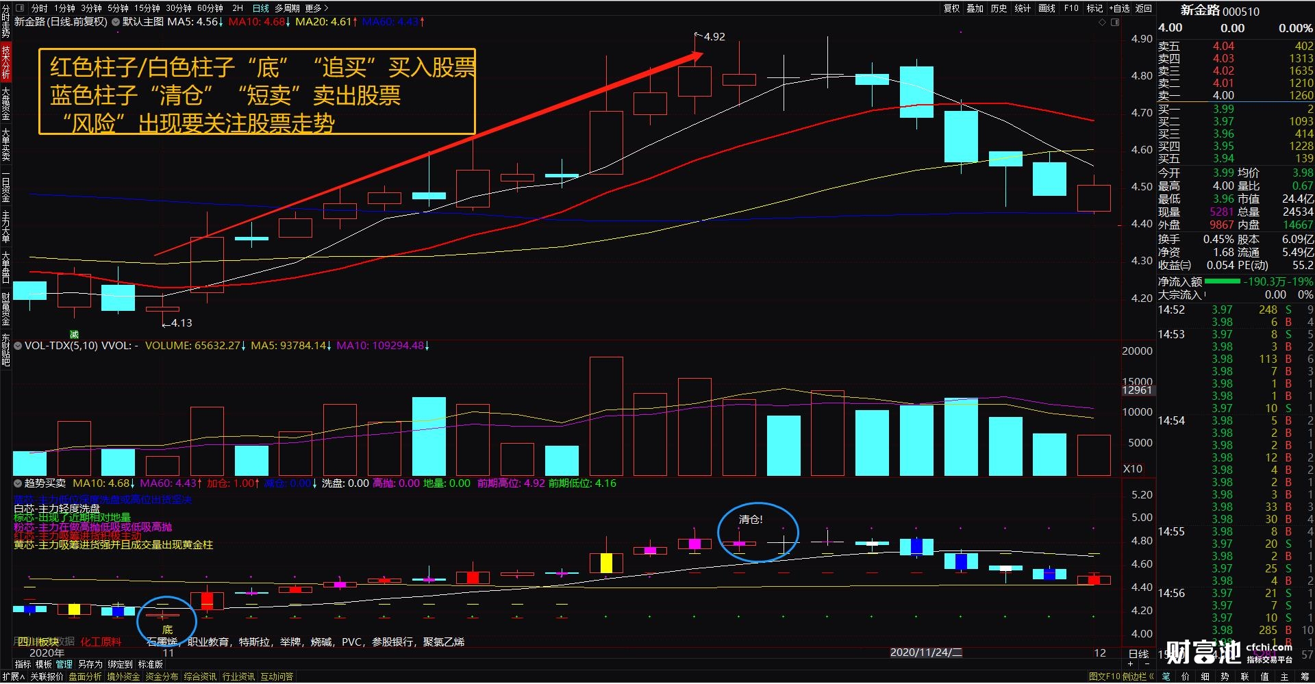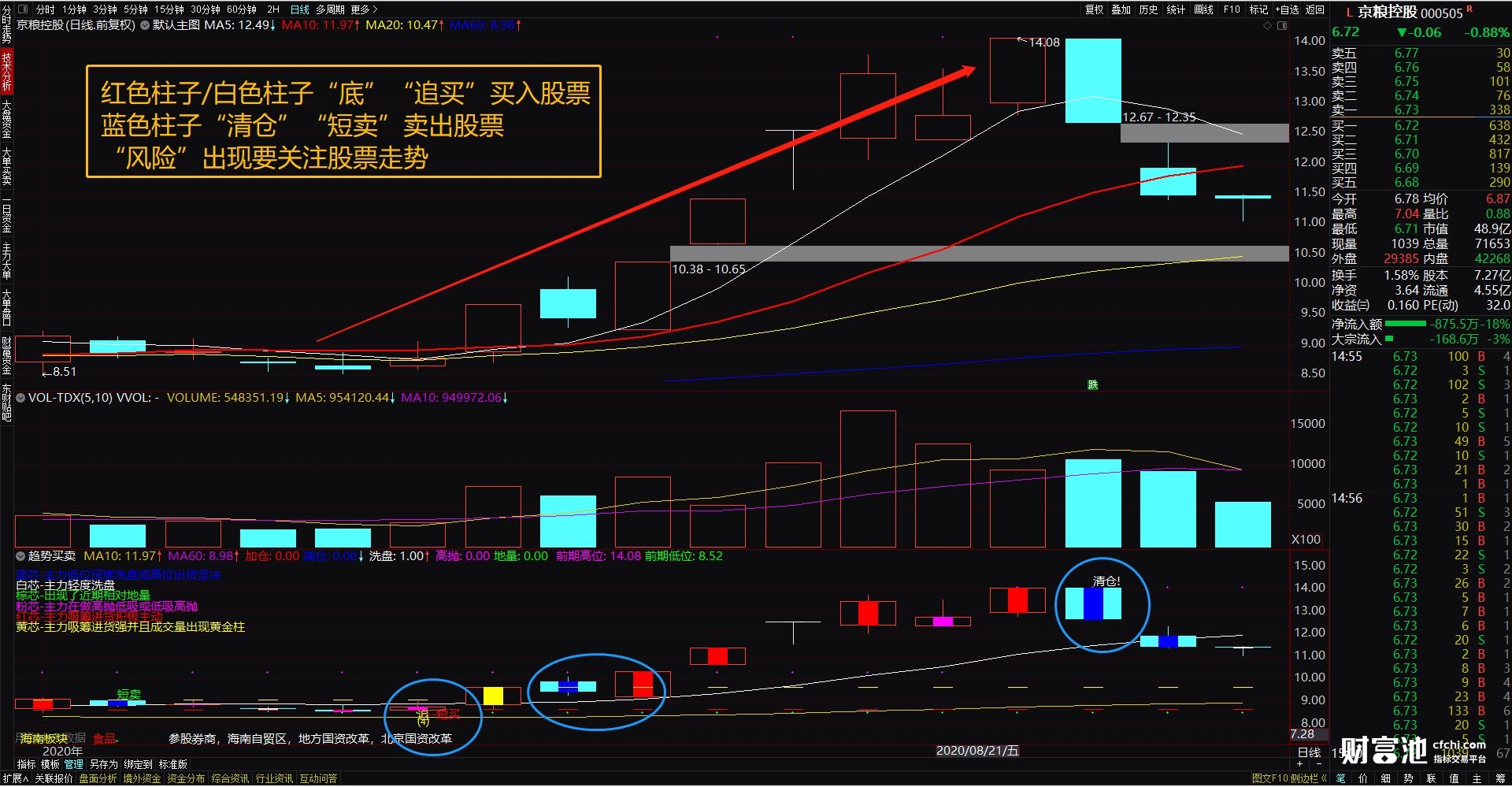 总的来说就是,蓝色柱子“清仓”出现就卖出股票,看到红色柱子或白色柱子“底”“追买”字就买入股票,“风险”字眼出现要关注股票走势,随时准备出仓。