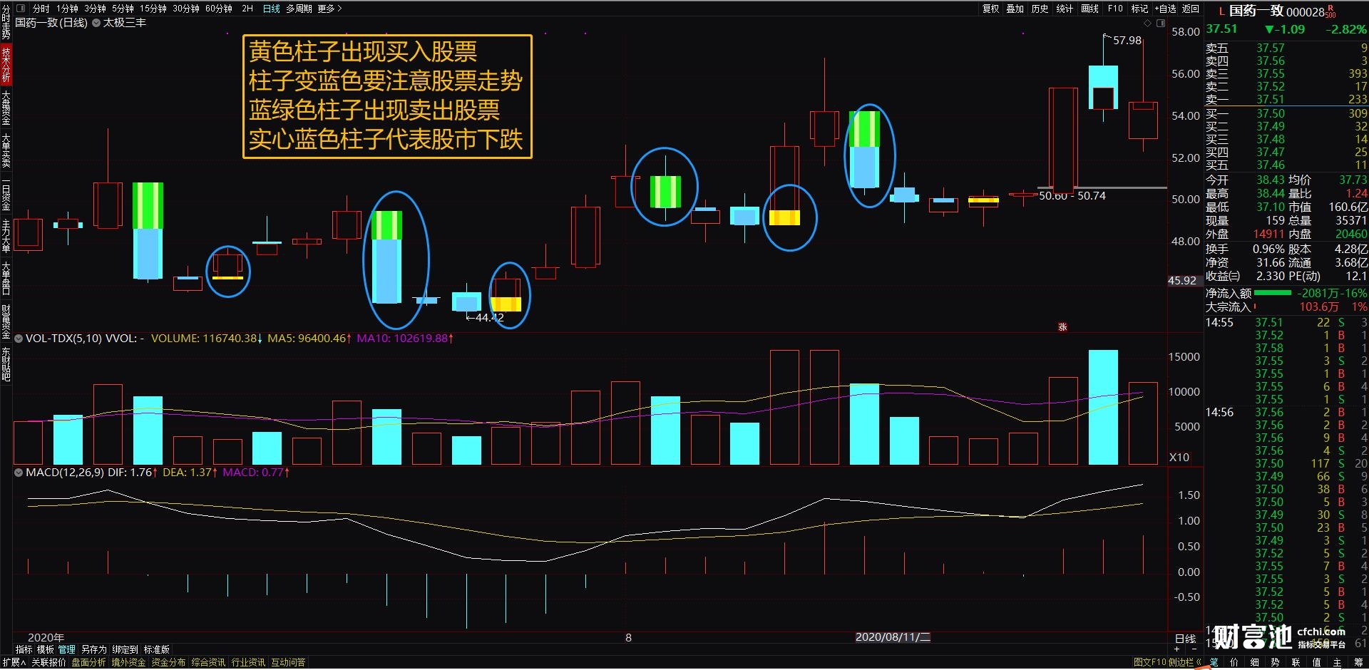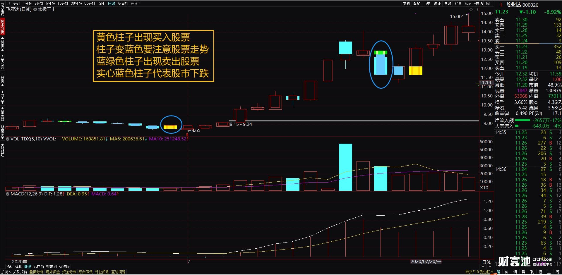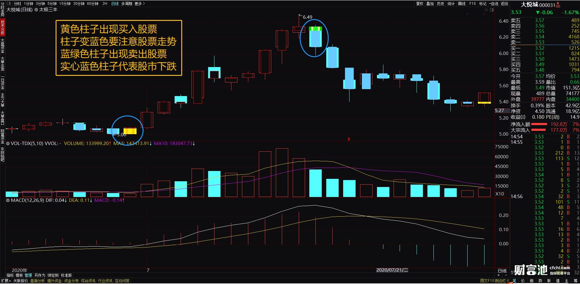 黄色柱子买入股票,柱子变蓝要注意股票走势,柱子蓝绿要卖出股票,实心蓝色柱子说明股价下跌。