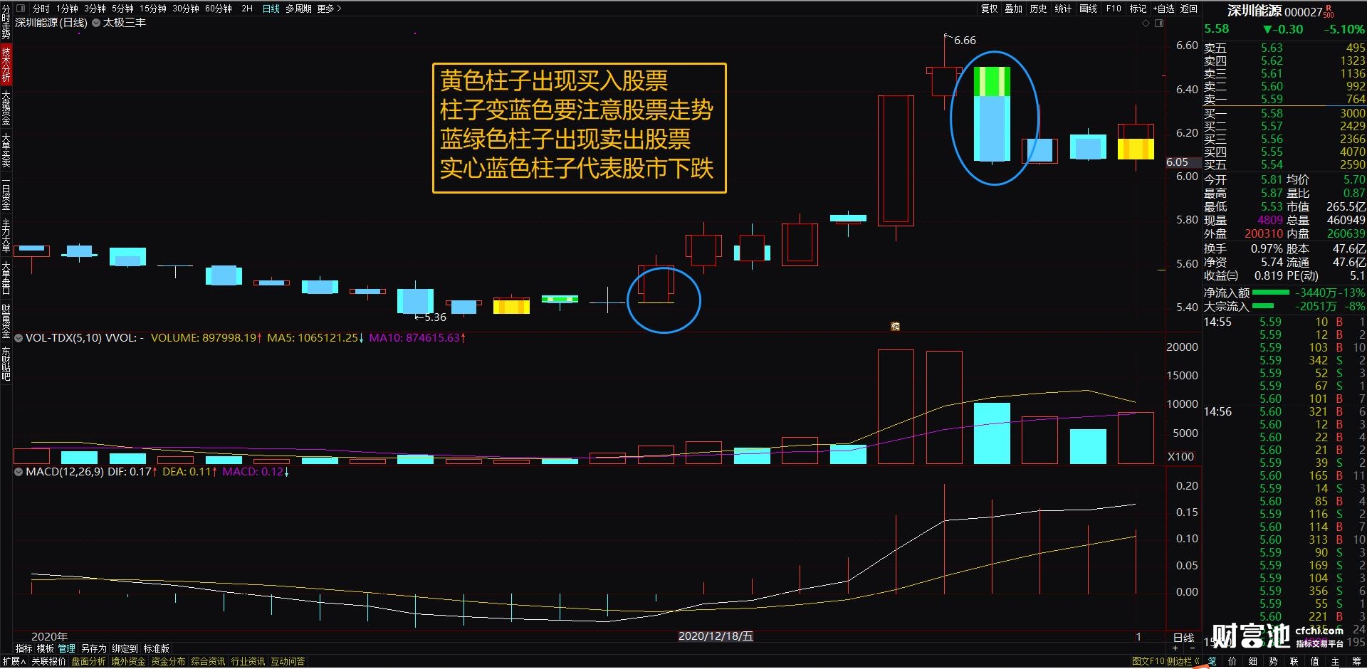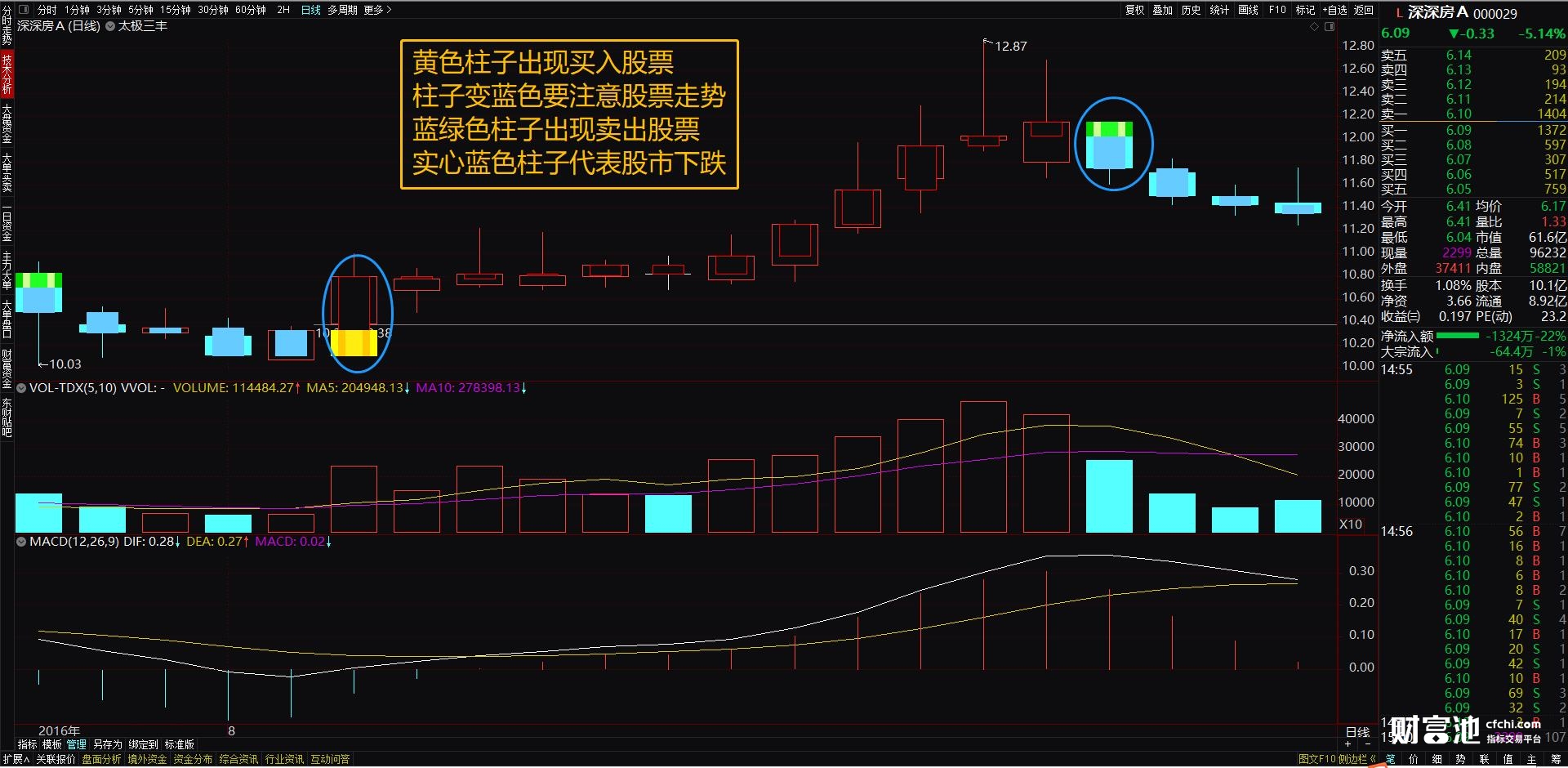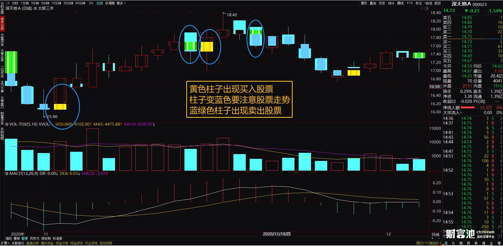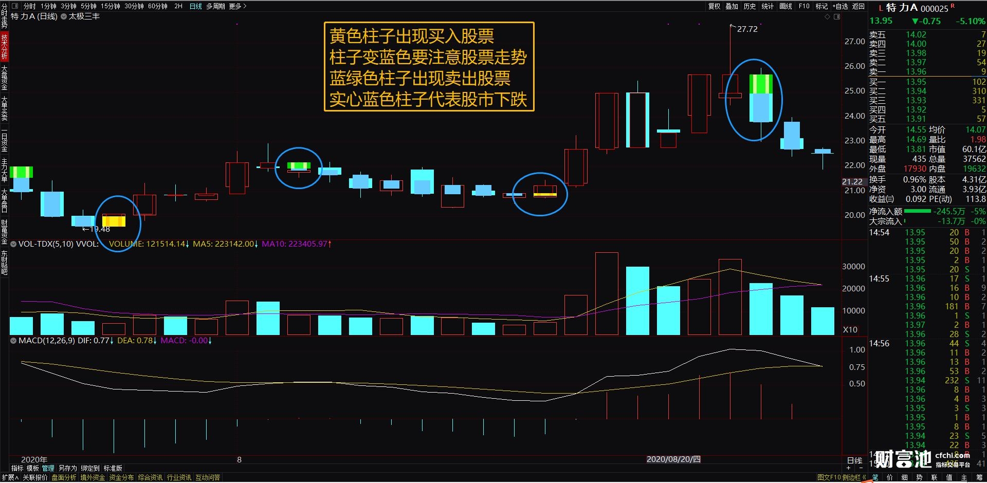 黄色柱子买入股票,柱子变蓝要注意股票走势,柱子蓝绿要卖出股票,实心蓝色柱子说明股价下跌。
