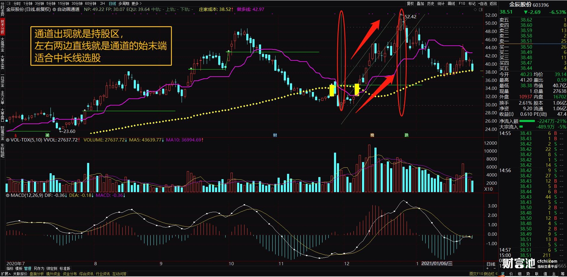 主要以“自动画通道”为主,图中画出股票的上涨通道就是我们的持股区,“庄家成本”和“大胆做多”线起辅助作用,可以结合一起看股票走势。