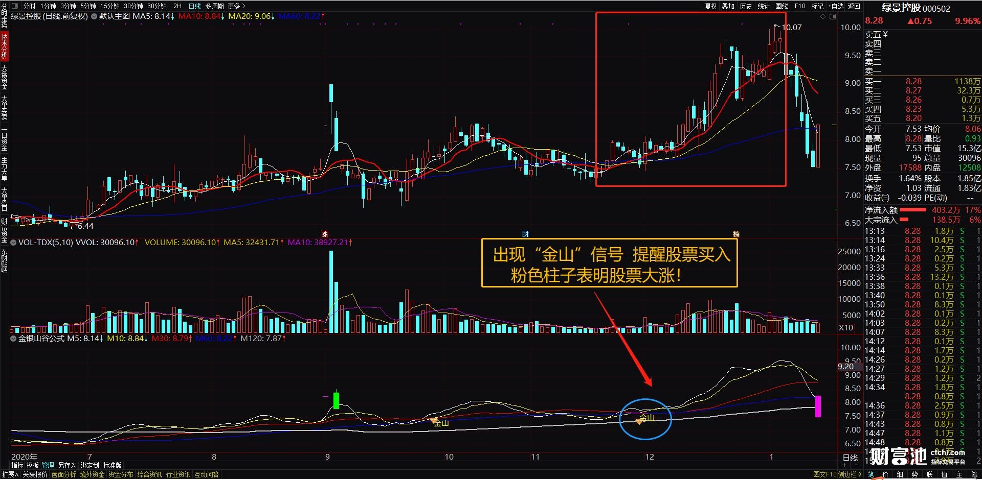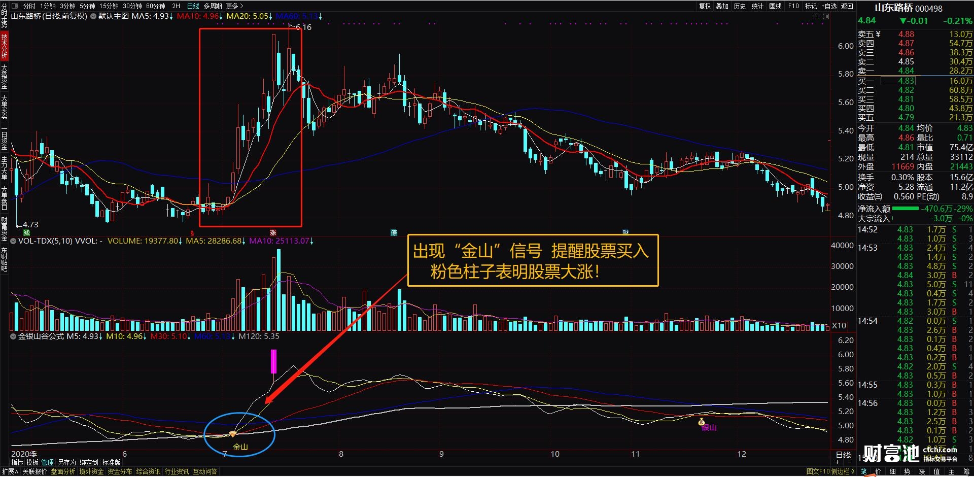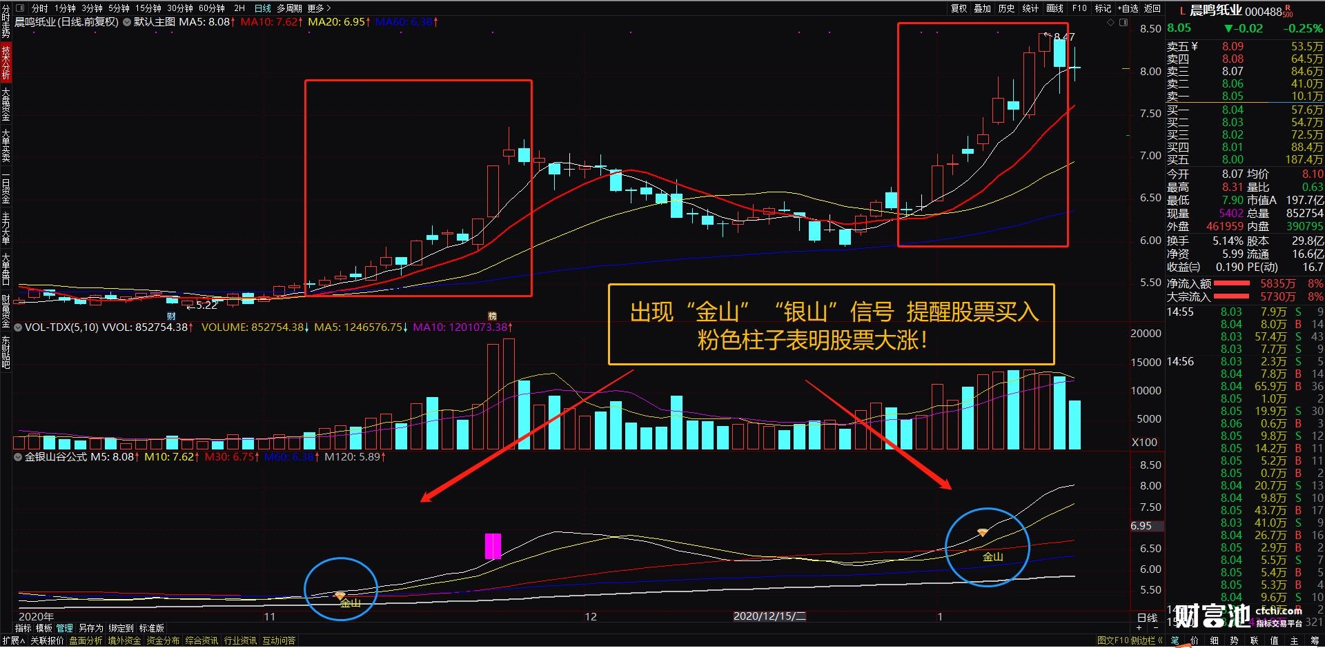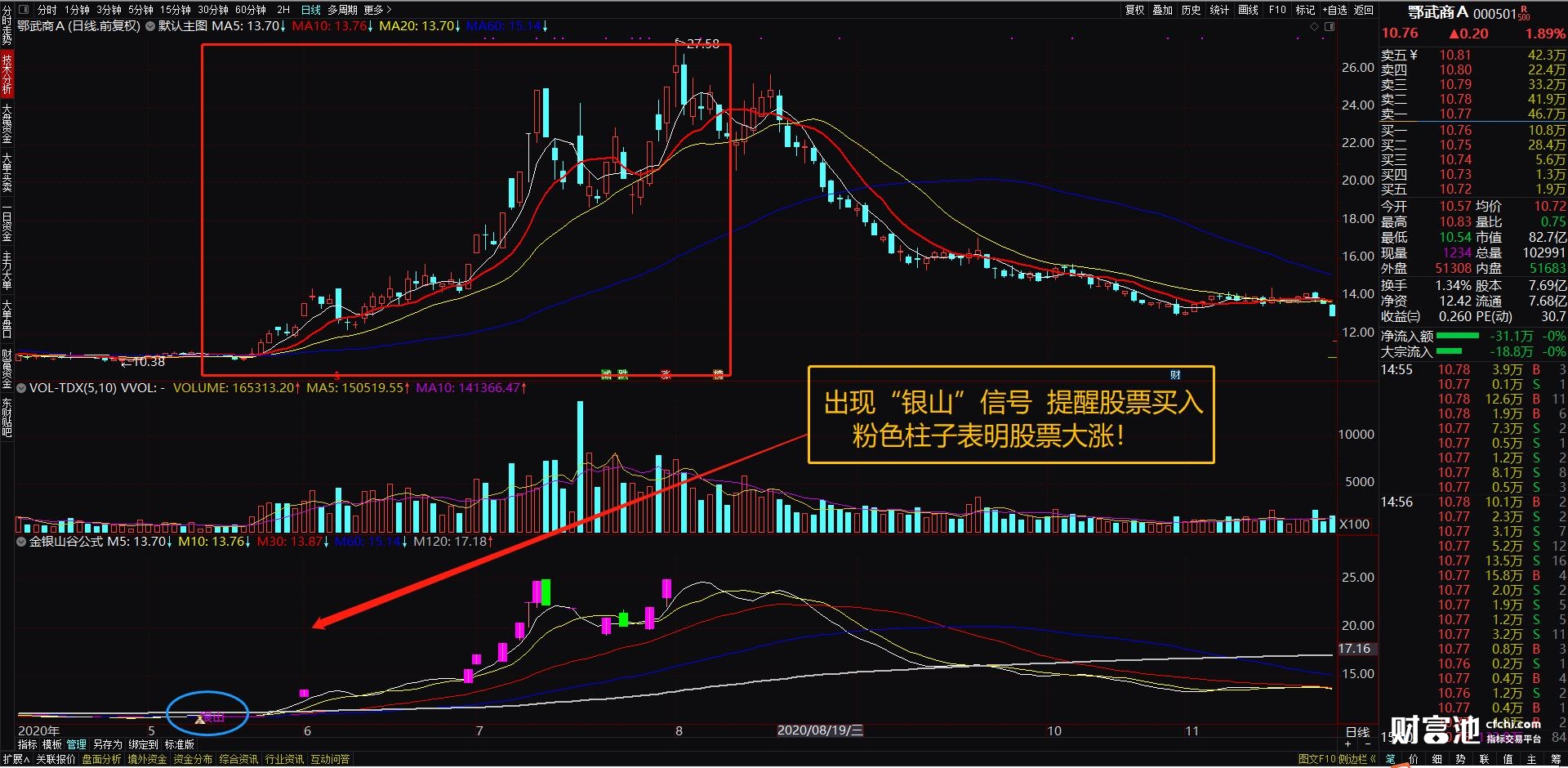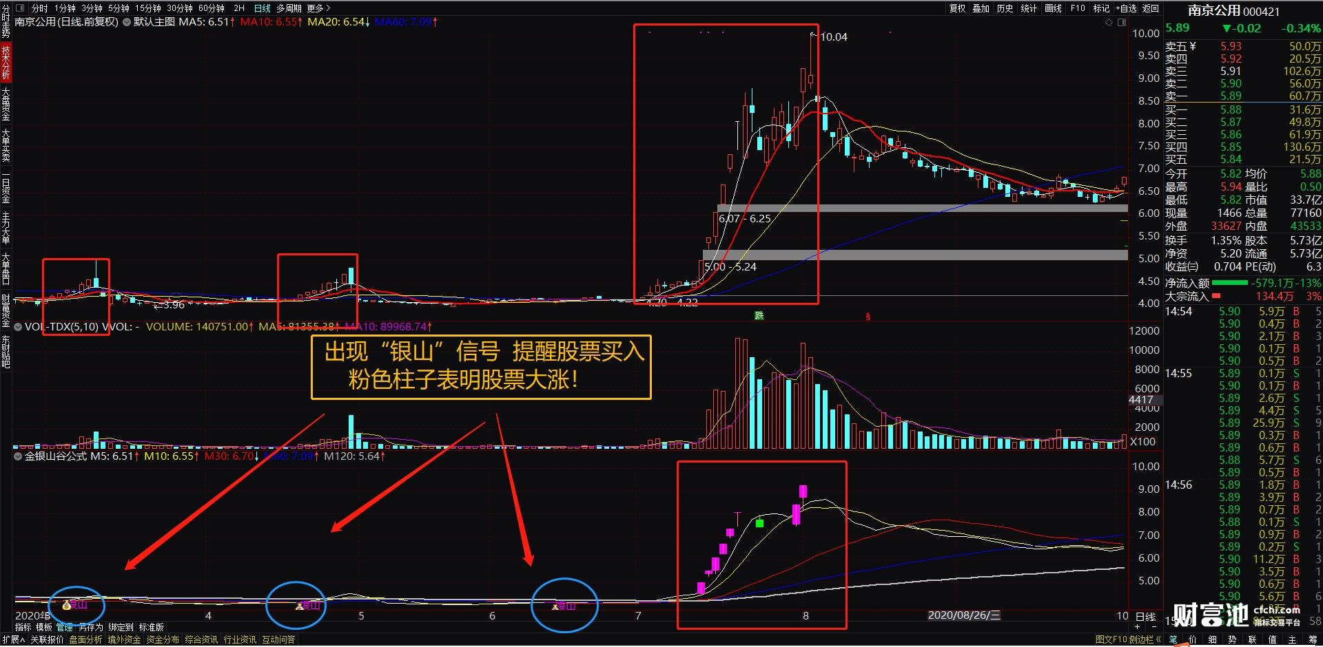 4、指标详解:出现“金山”“银山”都是要注意的买点信号,“粉色柱子”代表股价大涨,“绿色柱子”代表股价大跌。